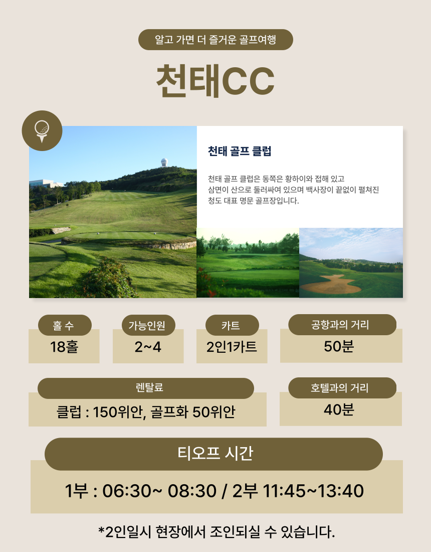 [중국 청도] 천태cc 티온리 예약 포함 18홀 그린피 / 캐디피 / 카트비 불포함 송영 차량 여행자 보험(개별 여행자 보험 가입을 권장 드립니다) 3인시 싱글카트비(130위안/18홀/1인) 캐디팁(100위안/18홀/1인) 마이리얼트립에서 예약하기 칭다오 목록 도시 목록