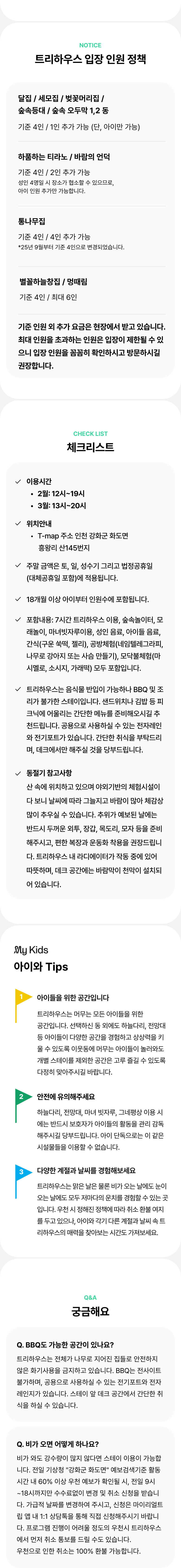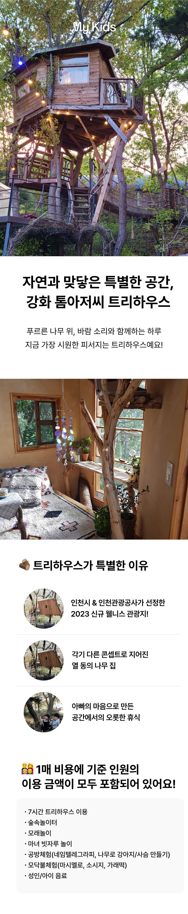 [키즈][인천/강화] 톰아저씨 트리하우스 숲체험&공방체험 (4인 기준) 본문: 로컬 DB 동기화 상세 평점 4.9 · 리뷰 553건 포함 * 7시간 트리하우스 이용 * 숲속놀이터 * 모래놀이 * 마녀빗자루 이용 * 성인 음료&아이들 음료 * 간식(구운 쑥떡, 젤리) * 공방 체험 (네임텔레그라피, 나무로 강아지 또는 사슴 만들기) * 모닥불 체험 (마시멜로, 소시지, 가래떡) 불포함 추가 음료 및 식사, 여행자 보험, 기준 인원 초과 금액 (25,000원) 마이리얼트립에서 예약하기 인천 목록 도시 목록