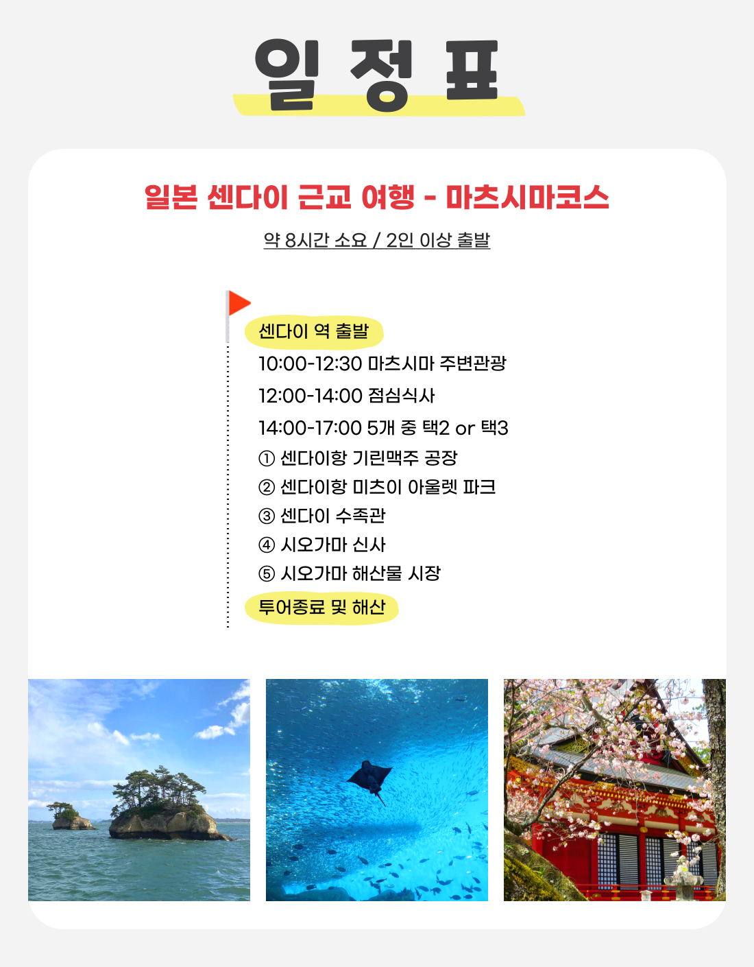 해안가 주변으로 마츠시마와 센다이항의 대표적인 관광지를 투어하는 코스입니다.