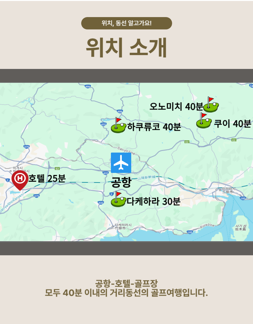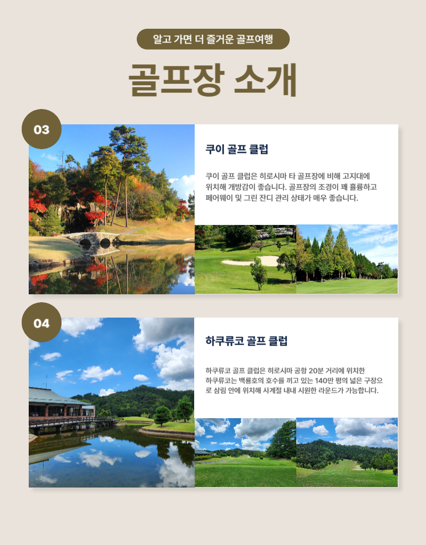 [일본] 히로시마 카모가와소 온천 호텔 + 54홀 3박 4일 가성비 패키지 포함 그린피 54홀 카트비 + 락카비 조식,중식,석식 공항-호텔-골프장 송영차량 호텔 3박 2인1실 (화실) 불포함 왕복항공권 및 여행자보험 개인적인 여행경비 캐디피 (노캐디로 미발생) 마이리얼트립에서 예약하기 히로시마 목록 도시 목록