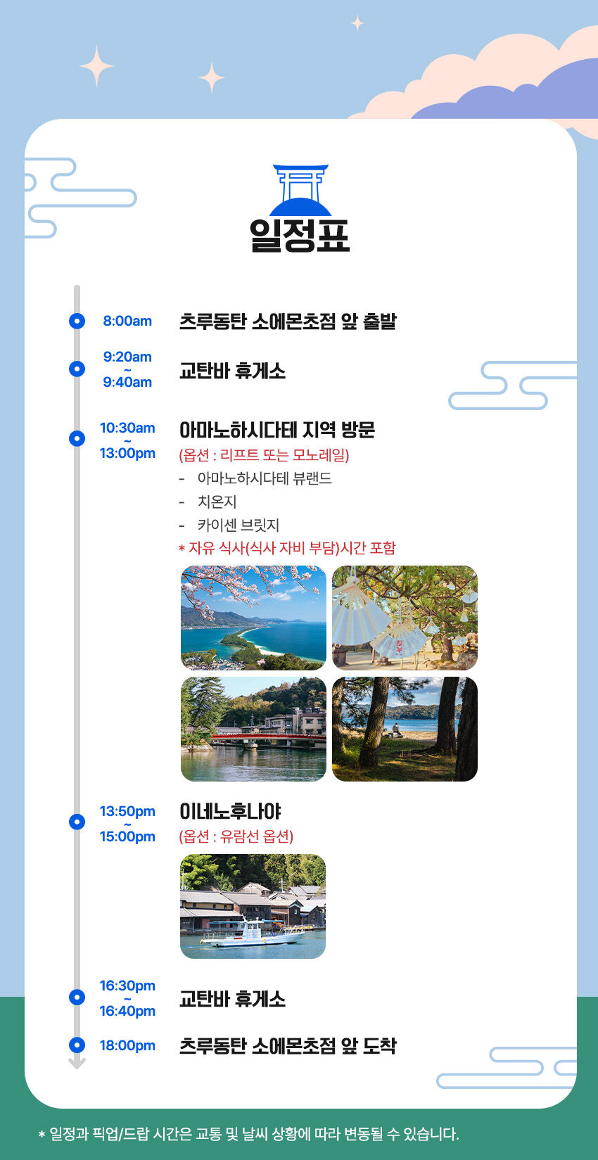 - - 식사 비용 - 개인 경비 - 개별 여행자 보험 - 관광지 입장료 및 체험비 ※ 본 투어에는 관광지 입장료 및 체험비가 포함되어 있지 않으므로, 예약 시 참고 부탁드립니다. 아래 체험은 옵션 사항으로, 현장에서 원하실 경우 개별 결제 후 이용하실 수 있습니다: - 아마노하시다테 뷰랜드 리프트 또는 모노레일: 850엔 - 이네 노 후나야 보트: 1000엔