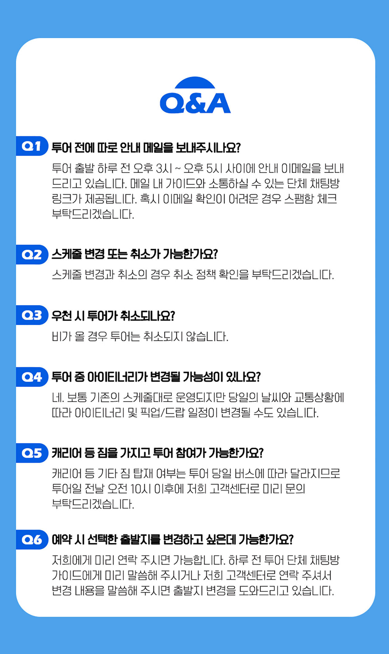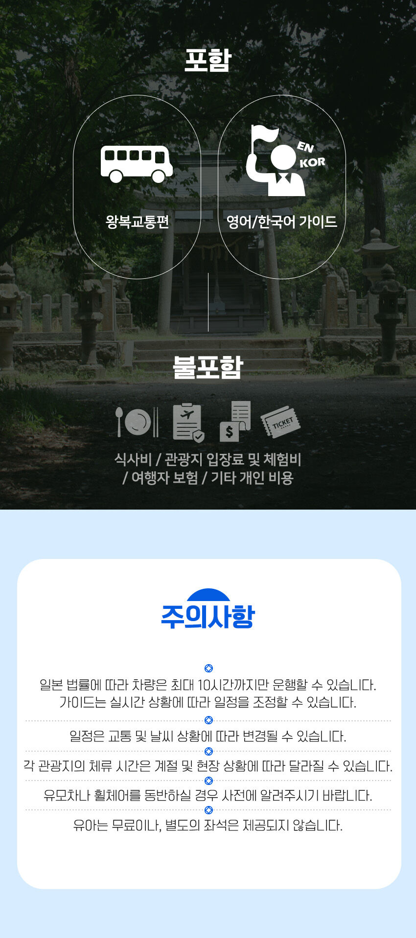 - - 왕복 교통편 - 영어&한국어 가이드 - 차량 제반 비용(차량비, 유류비, 기타 제반 비용 포함)