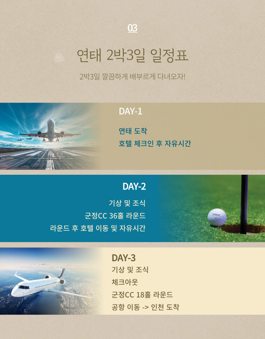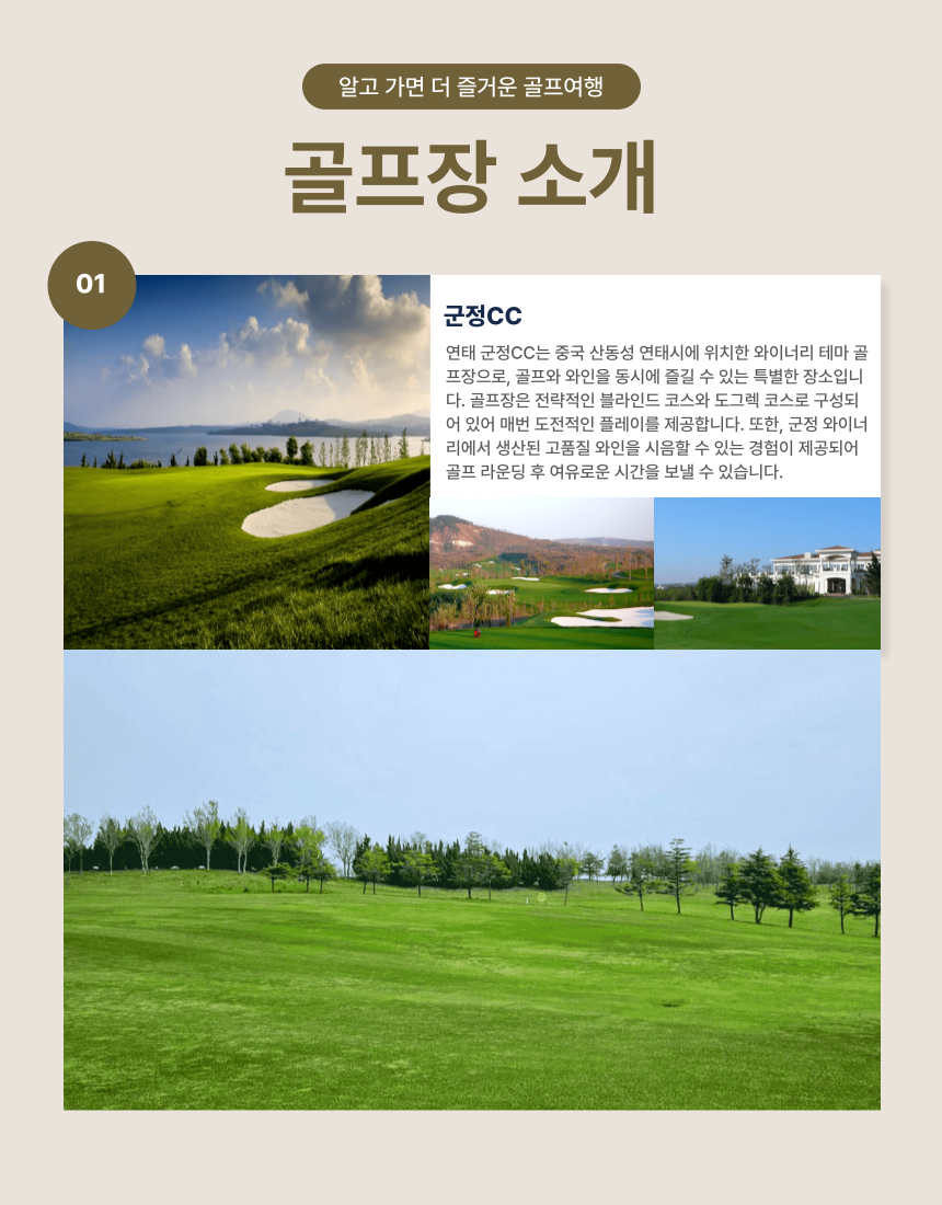 [중국 연태] 군정CC 군정 힐튼호텔 2박 (54홀) 포함 그린피 54홀 호텔 2박 조식 2회 석식 1회 불포함 왕복항공권 및 여행자보험 개인적인 여행 경비 캐카비 (300위안/18홀/1인) 캐디팁 (100위안/18홀/1인) 미팅샌딩비 (300위안/인) 마이리얼트립에서 예약하기 칭다오 목록 도시 목록