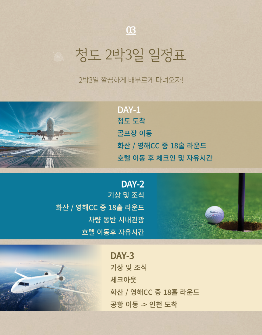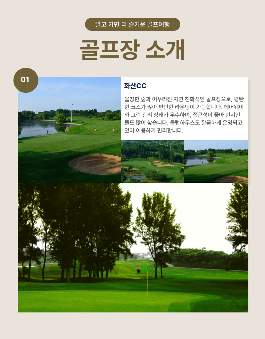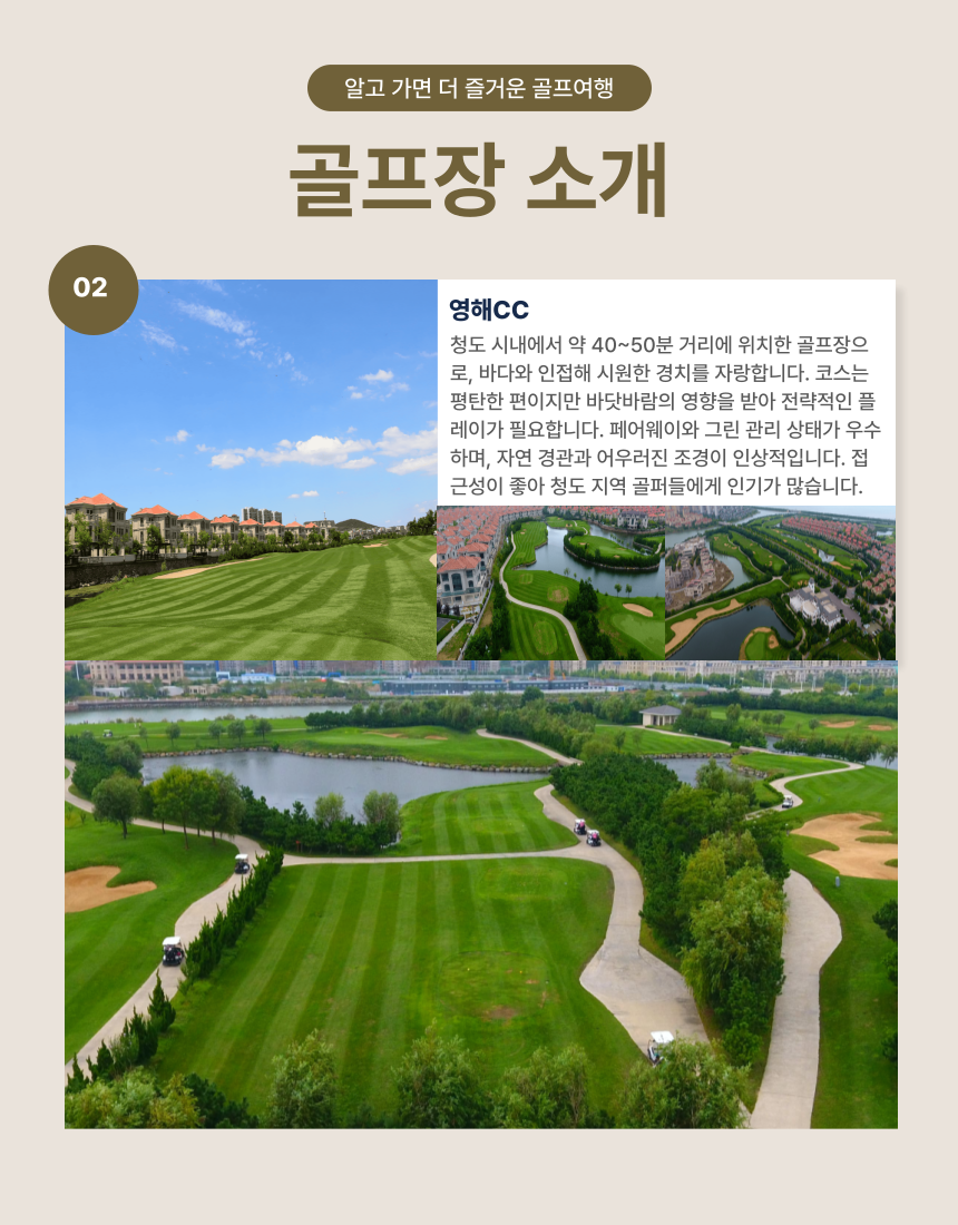 [중국 청도] 화산/영해CC + 청도 시내 관광 2박 (골프 54홀 + 시내관광) 포함 그린피 54홀 호텔 2박 2일차 시내관광 조식 , 석식1회 불포함 왕복항공권 및 여행자보험 개인적인 여행 경비 중식,석식 미팅샌딩비 (400위안/인/인) - 4인기준 (선택사항,현장결제) 카트비+캐디피 (300위안/18홀/인) 마이리얼트립에서 예약하기 칭다오 목록 도시 목록