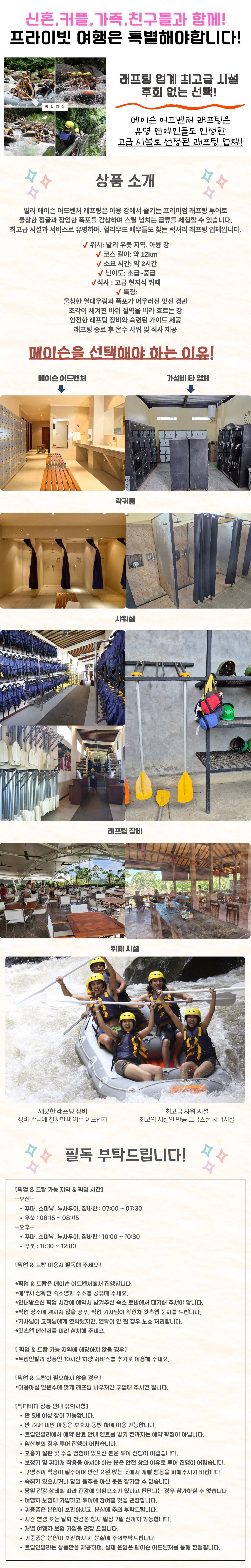 [아융강] 래프팅 최고급 시설, 메이슨 어드벤처 럭셔리 래프팅 (최고급 샤워시설/뷔페) 평점 5 · 리뷰 12건 포함 픽업 & 드랍 (옵션 선택 가능) 안전 교육 및 전문 가이드 동반 래프팅 장비 웰컴 드링크 & 점심 뷔페 제공 락커 및 샤워 시설 이용 보험 수건 불포함 기사님 개인 팁 래프팅 전문 가이드 개인 팁 개인경비 마이리얼트립에서 예약하기 발리 목록 도시 목록