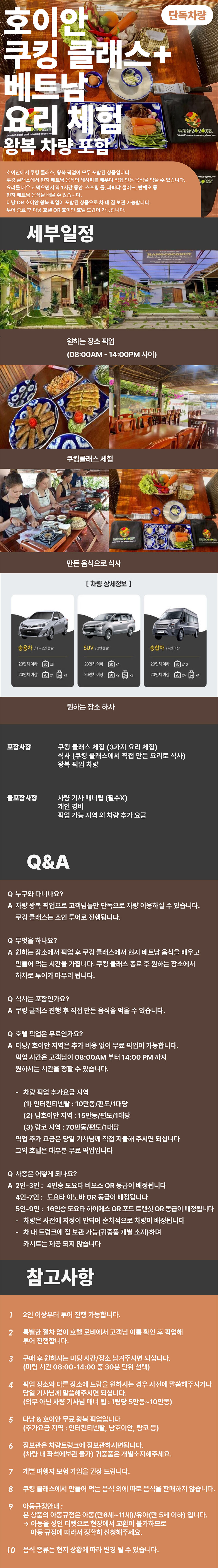 [단독차량] 호이안 쿠킹 클래스+ 베트남 요리 체험 (왕복 차량 포함) 평점 5 · 리뷰 1건 포함 * 쿠킹 클래스 체험 (3가지 요리 체험) * 식사 (쿠킹 클래스에서 직접 만든 요리로 식사) * 왕복 픽업 차량 불포함 * 차량 기사 매너팁 (필수X) * 개인 경비 * 픽업 가능 지역 외 차량 추가 요금 마이리얼트립에서 예약하기 다낭 목록 도시 목록