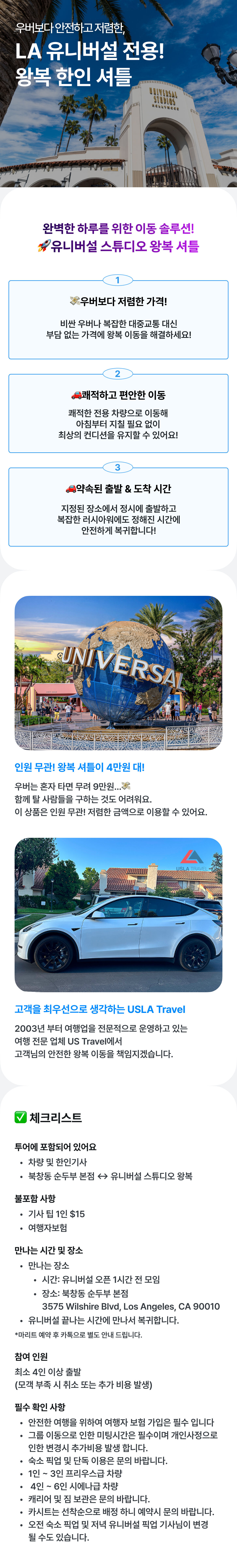 [그룹이동] 유니버설 스튜디오 왕복 한인 셔틀 (실속상품) 평점 5 · 리뷰 1건 💖 편안하게 유니버셜 스튜디오를 만나보세요! ✨ 포함 - 차량 및 한인기사 - 라인호텔 <=> 유니버셜 스튜디오 왕복 불포함 - 1인 팁 $15(편도기준) - 여행자 보험 - 유니버셜 스튜디오 입장권 마이리얼트립에서 예약하기 로스앤젤레스 목록 도시 목록