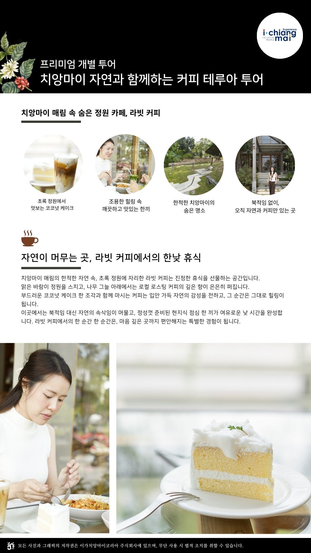 식사는 원하실 경우 사전 예약을 통해 라빗커피 레스토랑에서 이용 가능하며, 식사 가격은 약 150~200바트, 커피 및 음료는 80~180바트 정도로 안내됩니다.