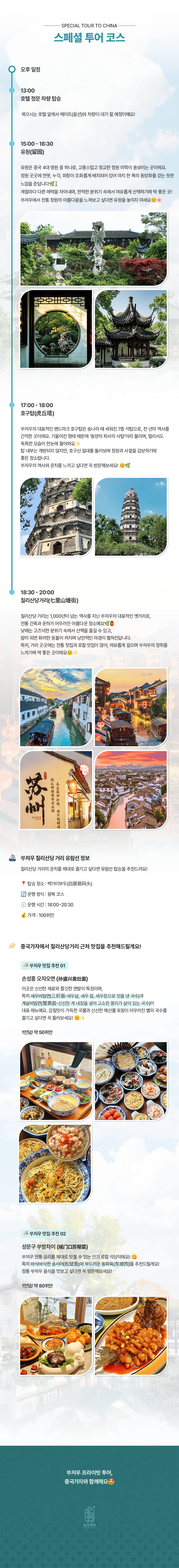 [상하이여행] 상하이 출발, 우리끼리 쑤저우 프라이빗 투어 평점 5 · 리뷰 4건 포함 프라이빗 차량(한국어 가능 기사님), 입장권(유원 및 호구탑), 메이트 투어 서비스(옵션) 불포함 식사 비용, 쇼핑 비용, 승선권, 개별 여행자 보험 마이리얼트립에서 예약하기 상하이 목록 도시 목록