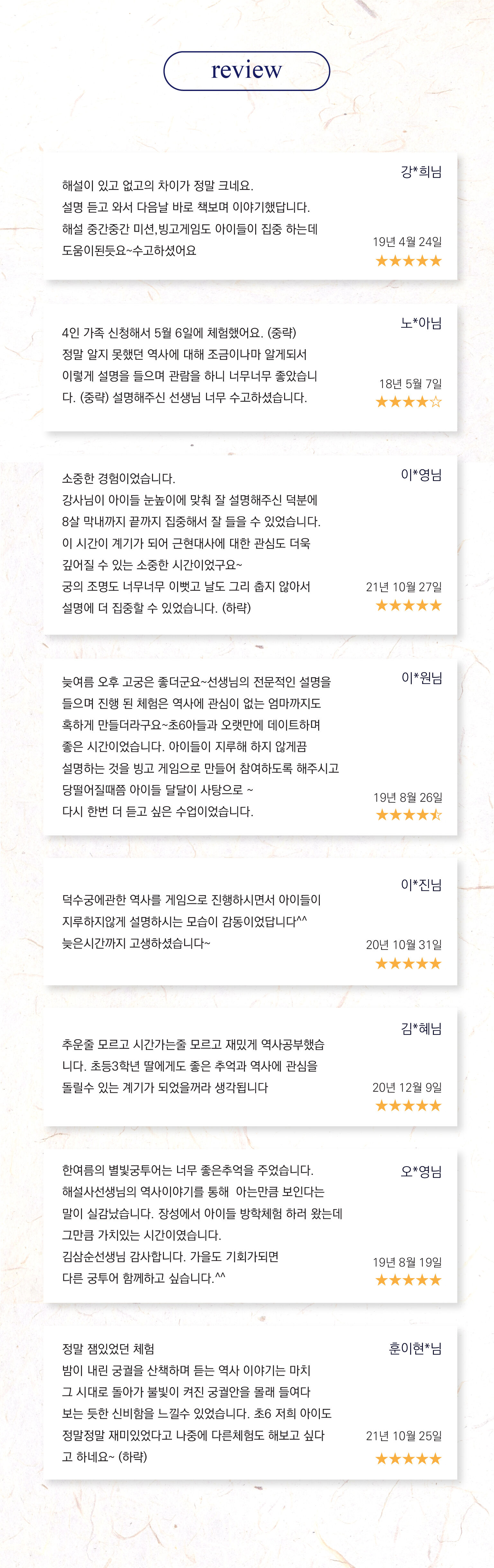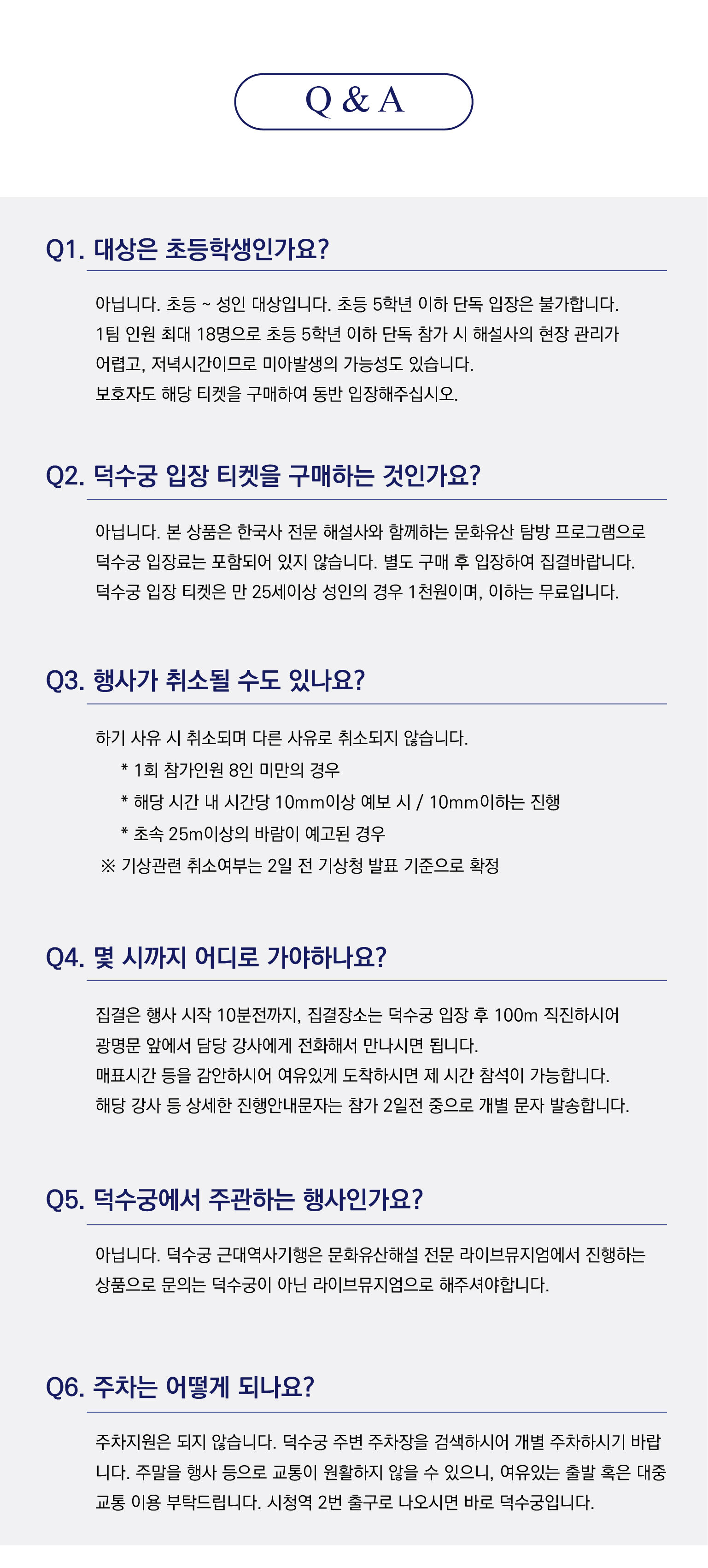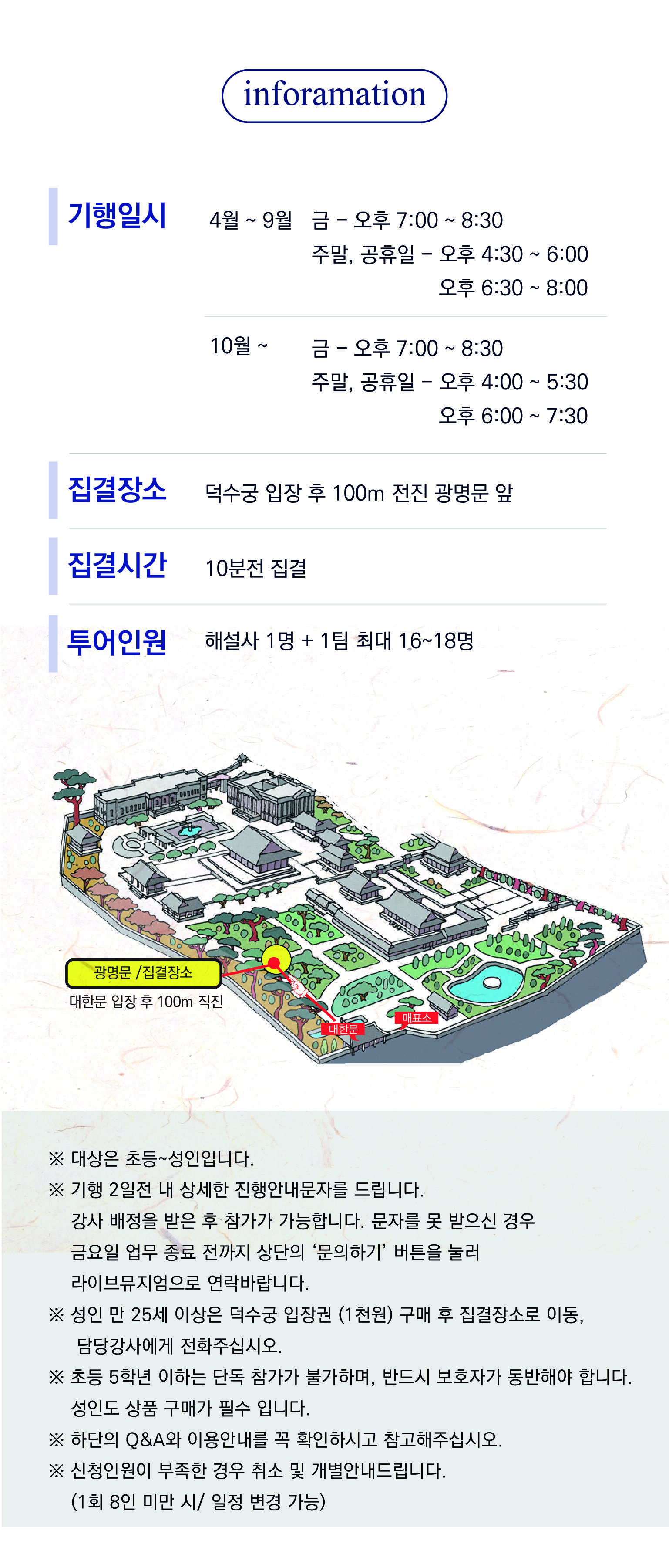 [서울/가이드투어/가족궁궐야행] 덕수궁 근대역사기행(아이와 함께) 본문: 로컬 DB 동기화 상세 평점 5 · 리뷰 2건 포함 덕수궁 해설사(가이드)비용 무선수신기 대여 비용 불포함 덕수궁 입장료 개인 유선 이어폰(준비 불가능할 시 미리 신청하면 무료 대여 가능) 여행자보험 마이리얼트립에서 예약하기 서울 목록 도시 목록