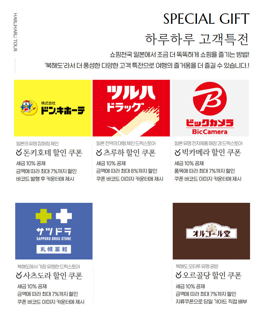 - 돈키호테, 츠루하, 빅카메라, 사츠도라, 오르골당 쿠폰 등 다양한 쇼핑 할인 쿠폰 제공 🎟