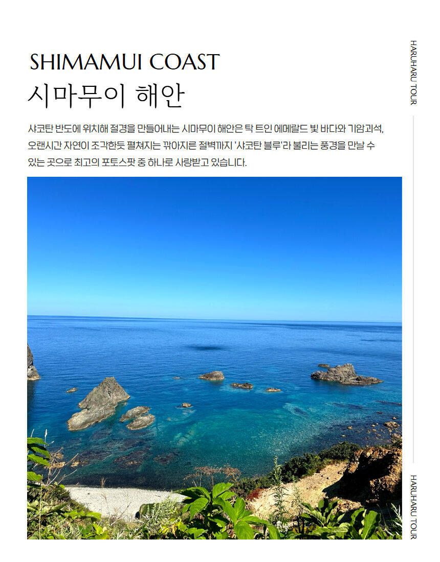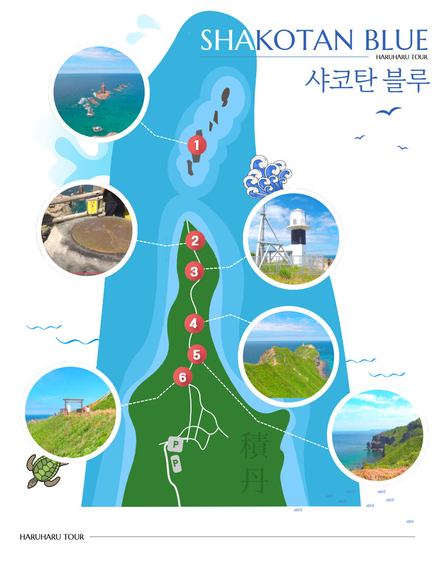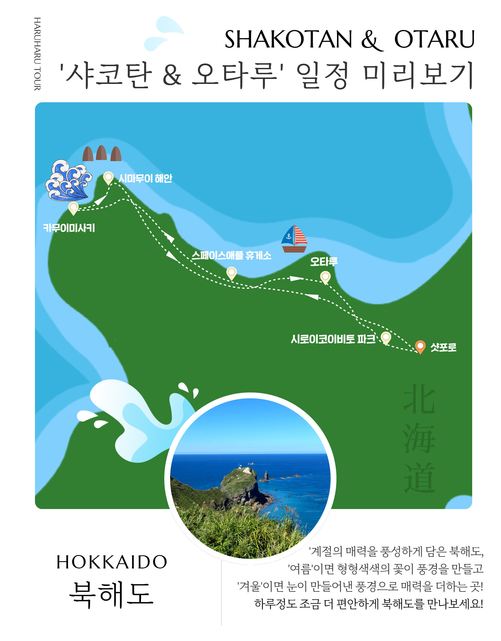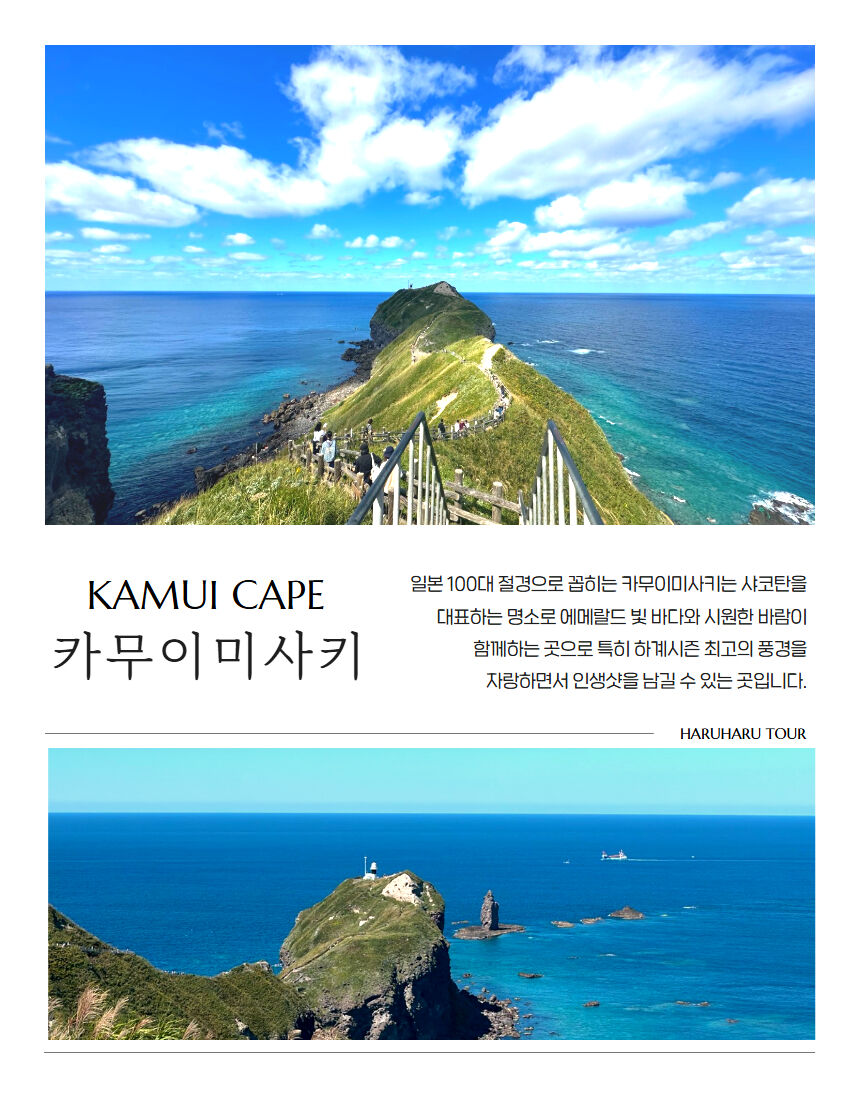 - 카무이미사키 : 홋카이도를 대표하는 절경 명소로, 맑고 푸른 ‘샤코탄 블루’ 바다를 감상할 수 있어요🌊