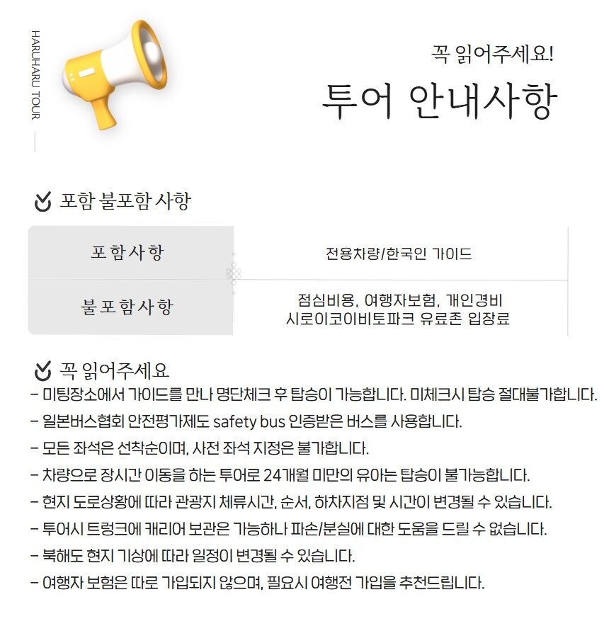 - 점심 식사비, 여행자 보험, 개인 경비, 입장료 - 시로이코이비토파크 유료존(성인 800엔 | 소인 400엔)