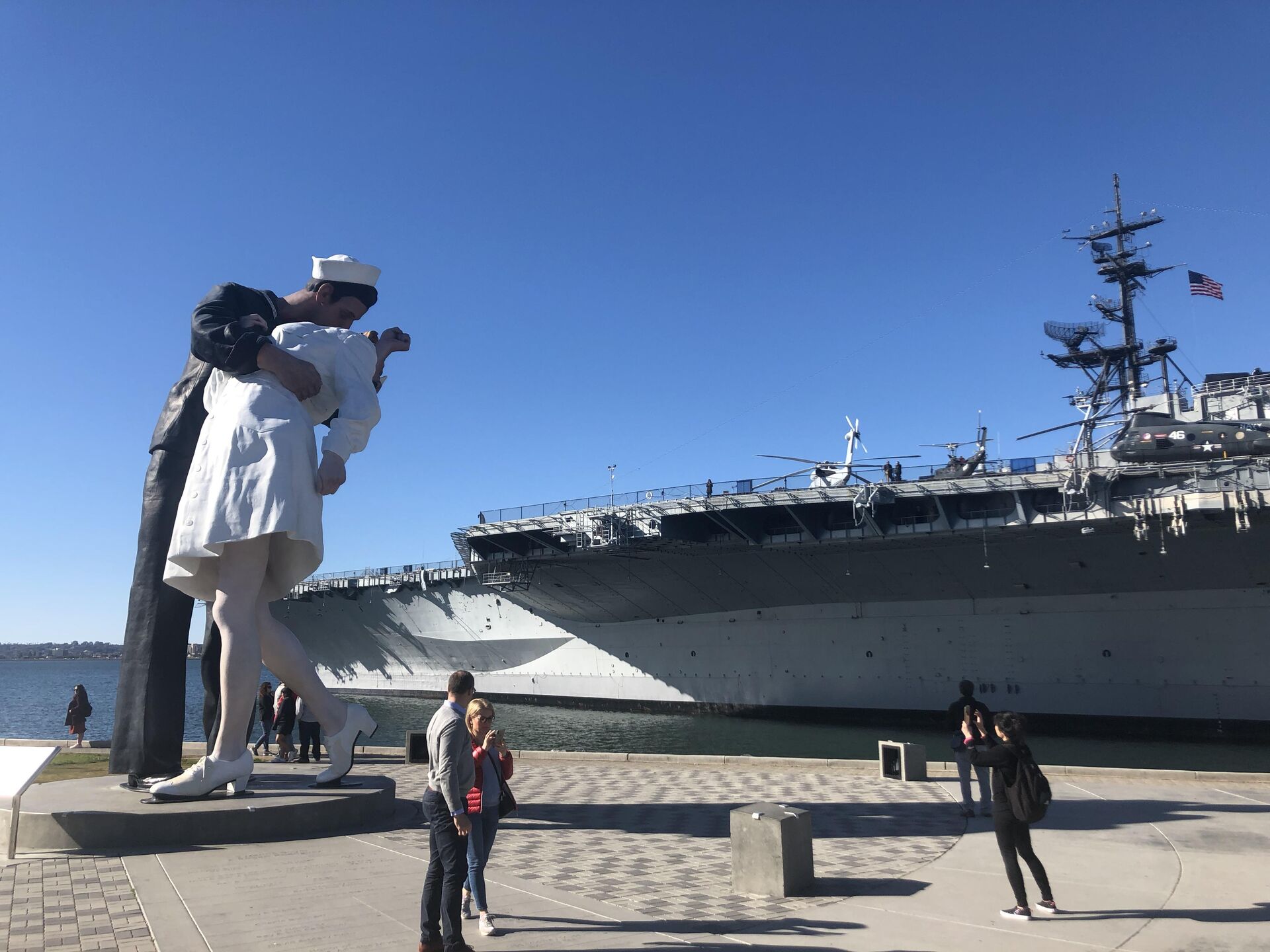 샌디에고 다운타운의 너무나 아름다운 씨포트 빌리지 Seaport Village 는 산책을 즐기는 관광객과 시민들에게 인기있는 곳입니다. 바다 위에 위용을 자랑하며 정박해 있는 USS 미드웨이호에 한 반 놀라고, 그 곳에서 갓 나왔을 것만 같은 커다란 '수병과 간호사'의 동상은 보자 마자 놀라움과 감탄으로 우리 모두를 사로 잡는 포토 스팟입니다. 이 곳에서 같은 포즈로 찰칵!