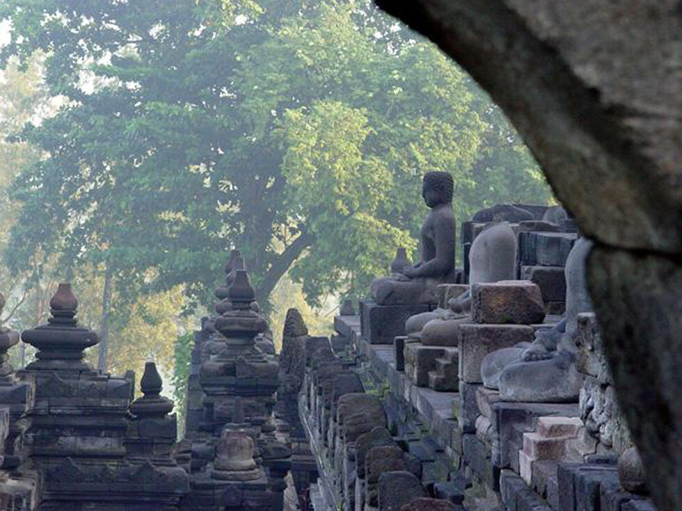 보로부두르 사원의 전경이 드디어 모습을 드러냅니다.