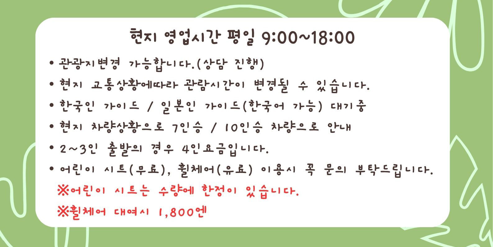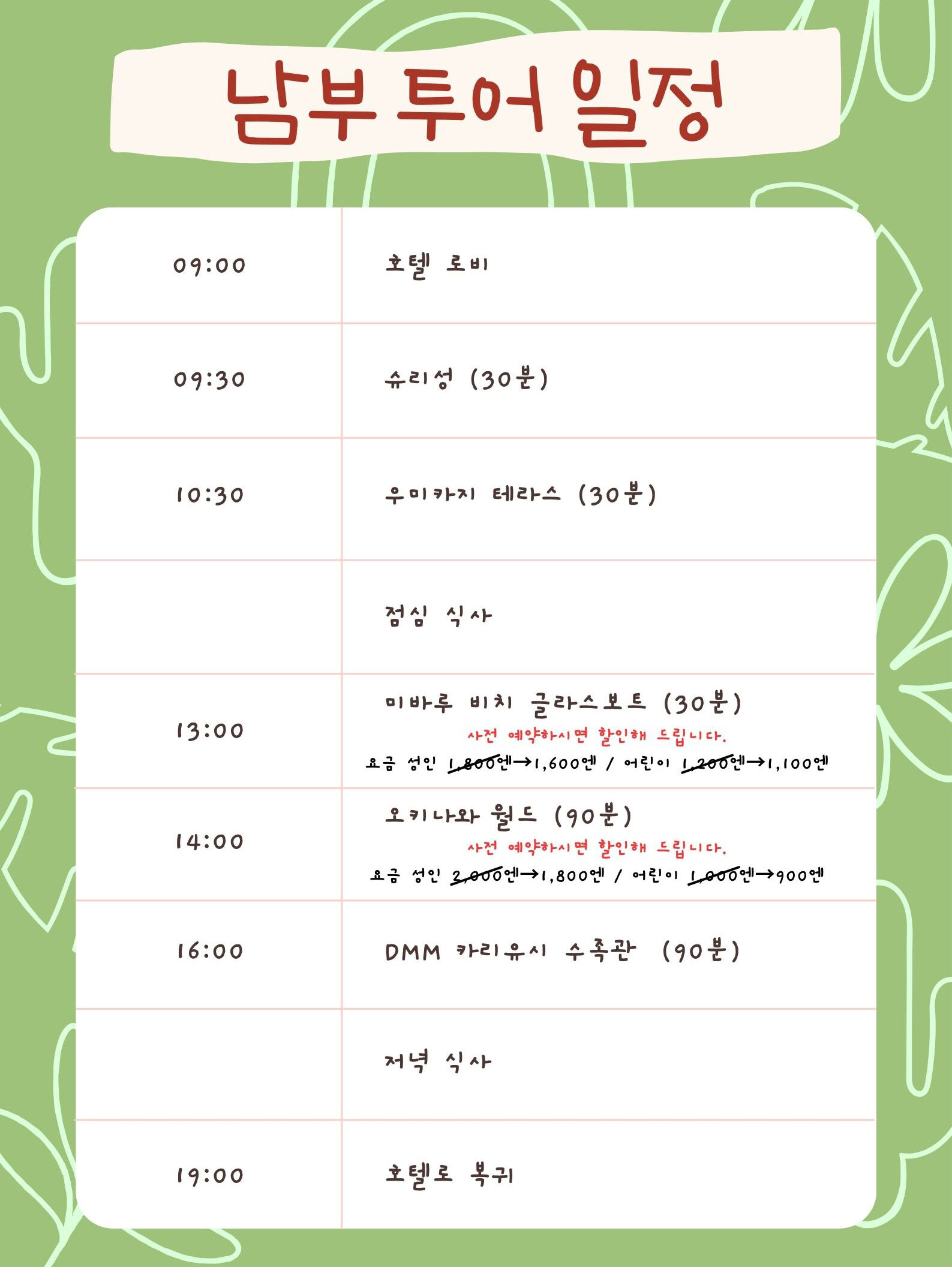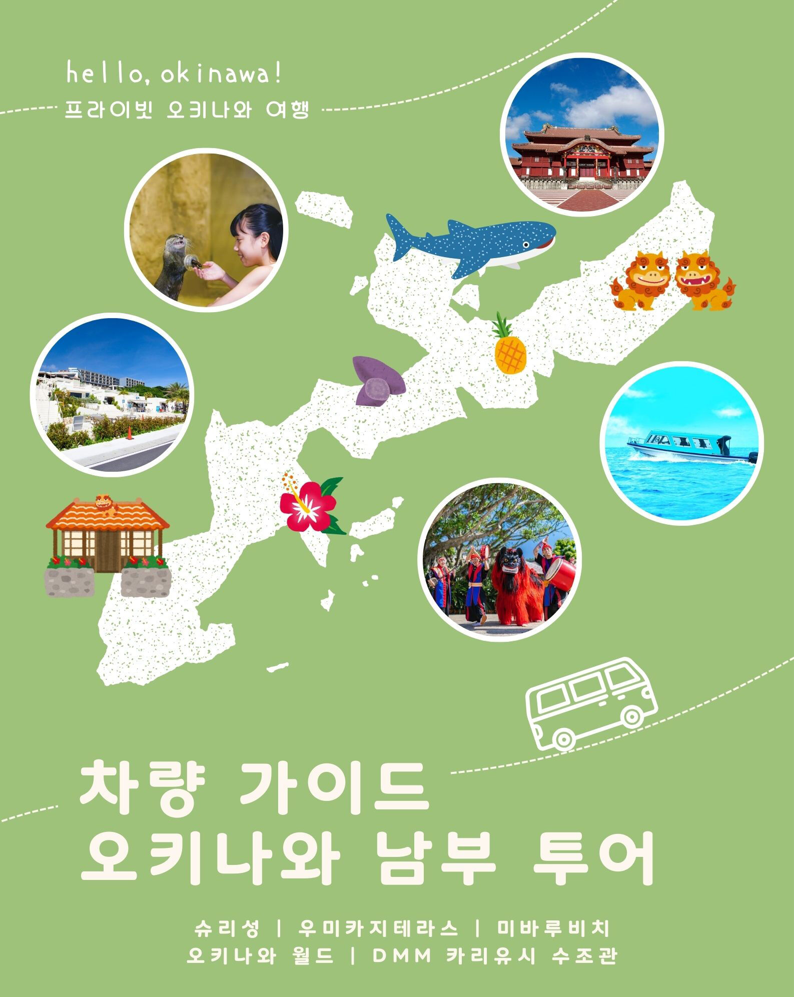 [오키나와 남부&한국어 차량 가이드] 단독 관광 1일 / 상담 후 일정 변경 가능 평점 5 · 리뷰 1건 포함 차량운행비 - 고속도로비, 연료비, 주차비 가이드비 - 교통비, 식사비 차량 보험 불포함 - 여행자 보험 - 관광지 입장료 미바루 비치 글라스보트 성인 1,800엔, 어린이 1,200엔 / 오키나와 월드 성인 2,000엔, 어린이 1,000엔 DMM 카이유시 수족관 18세이상 2,800엔, 13~17세 2,200엔 4~12세 1,700엔 -개인 경비 마이리얼트립에서 예약하기 오키나와 목록 도시 목록