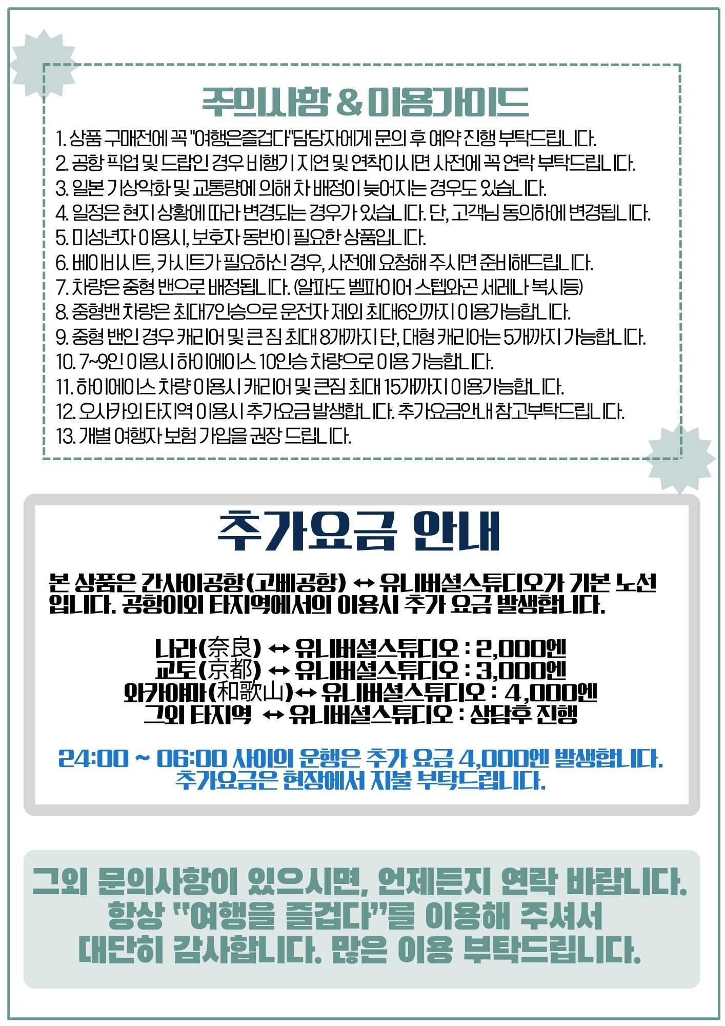 - ❗간사이공항 및 고베공항외 타지역 이용시 추가 요금이 발생합니다. ❗추가요금은 현장에서 지불 부탁드립니다. ❗24:00 ~ 06:00 사이의 운행은 추가요금이 4,000엔 발생입니다. 🚙 나라(奈良) ↔ 유니버셜스튜디오 : 2,000엔 🚙 교토(京都) ↔ 유니버셜스튜디오 : 3,000엔 🚙 와카야마(和歌山) ↔ 유니버셜스튜디오 : 4,000엔 🚙 그외 타지역 ↔ 유니버셜스튜디오 : 문의하기를 통해 연락부탁드립니다.