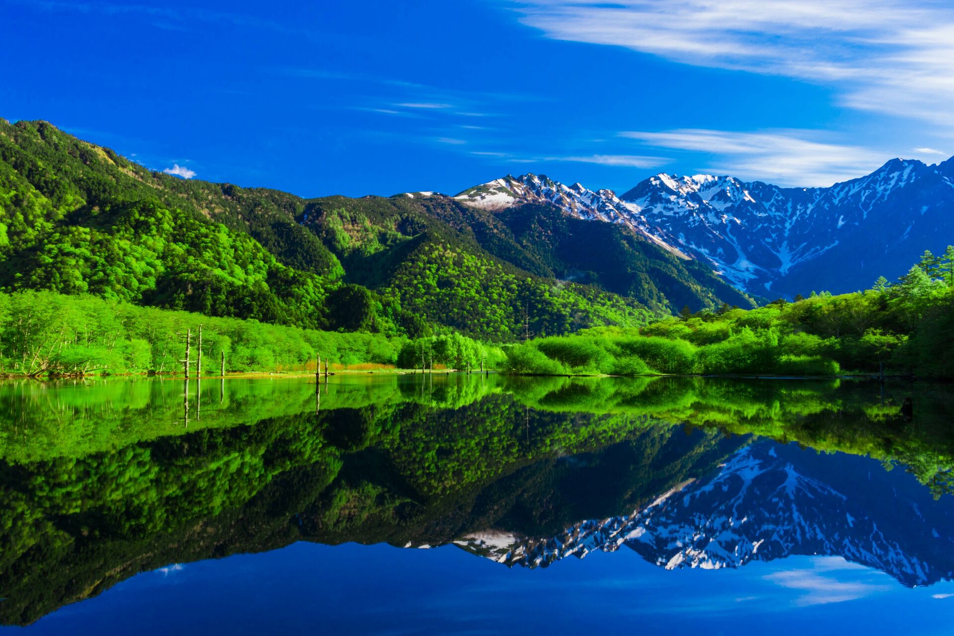 야케산과 호타카 산맥이 수면에 아름답게 비치는 매혹적인 연못으로 가미코치의 상징적인 풍경입니다.