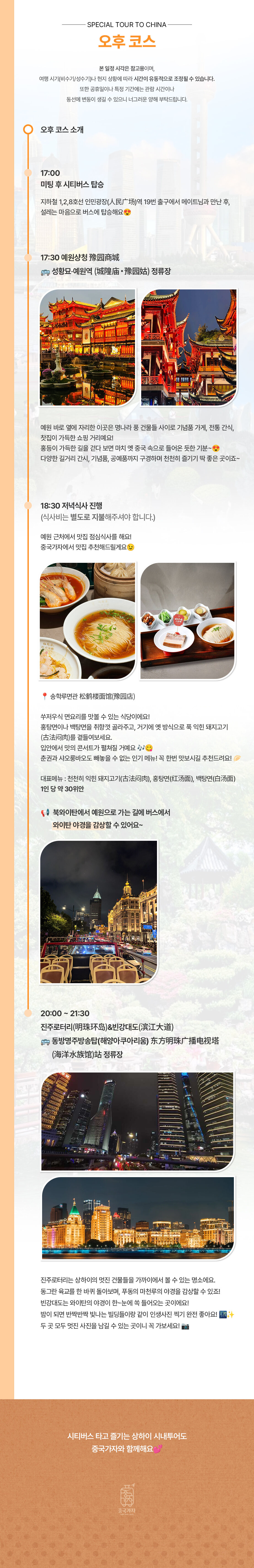 [상하이여행] 시티버스 타고 즐기는 상하이 반일 프라이빗 투어 평점 5 · 리뷰 5건 포함 메이트 투어 서비스, 시티버스 탑승권, 입장권 불포함 식사 비용, 쇼핑 비용, 개별 여행자 보험, 포함사항 외 발생 비용 마이리얼트립에서 예약하기 상하이 목록 도시 목록