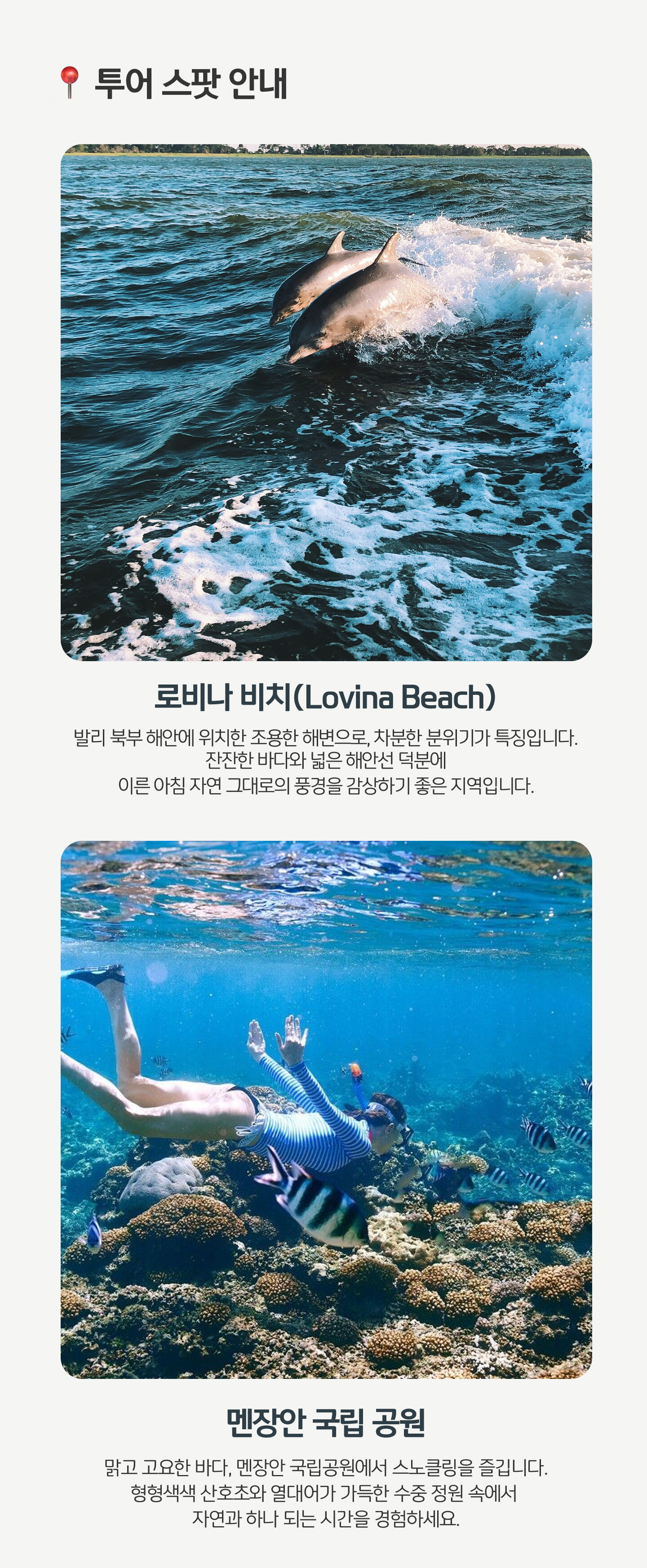 [발리북부] 돌고래 일출 & 멘장안 스노클링 인생샷 데이투어 평점 5 · 리뷰 10건 포함 호텔↔투어장소 이동(차량) 기사(영어) 돌고래 일출&스노클링 전용 보트 관광지 입장료 스노클링 장비 점심 식사 불포함 아침 식사,여행자 보험 및 팁,개인 경비 마이리얼트립에서 예약하기 발리 목록 도시 목록