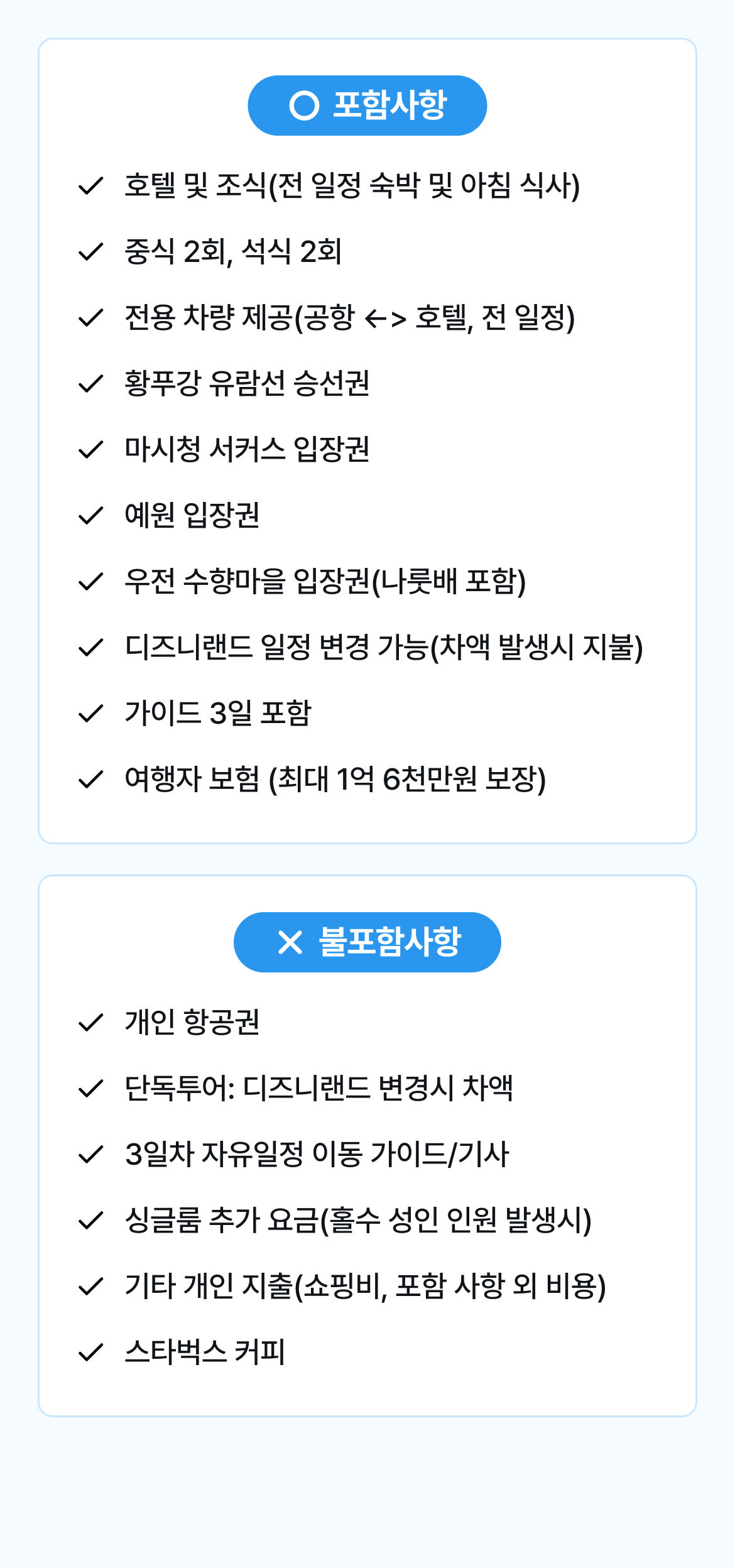 - - 개인 항공권 - (단독투어): 디즈니랜드 변경시 차액 - 4일차 자유일정 이동 가이드/기사 - 싱글룸 추가 요금(홀수 성인 인원 발생시) - 기타 개인 지출(쇼핑비, 포함 사항 외 비용)