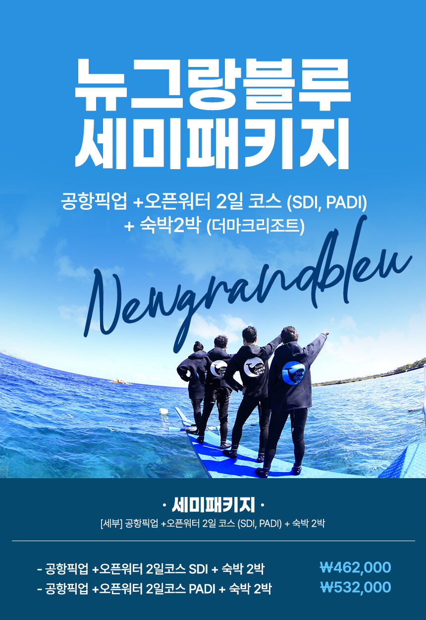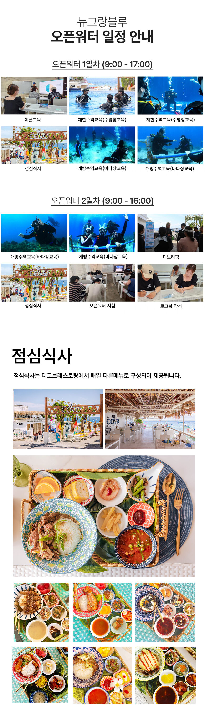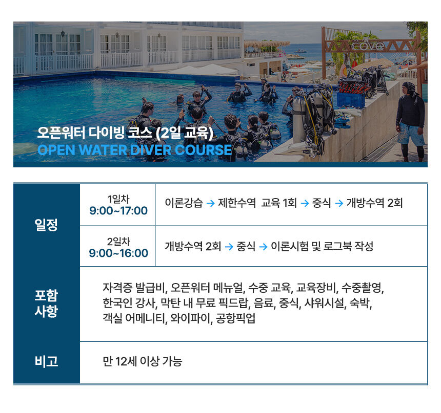 - -공항픽업 -2박 숙박 -조식 -자격증발급비 -오픈워터 교재 - 제한수역 및 개방수역 교육 - 교육중 중식 - 장비일체