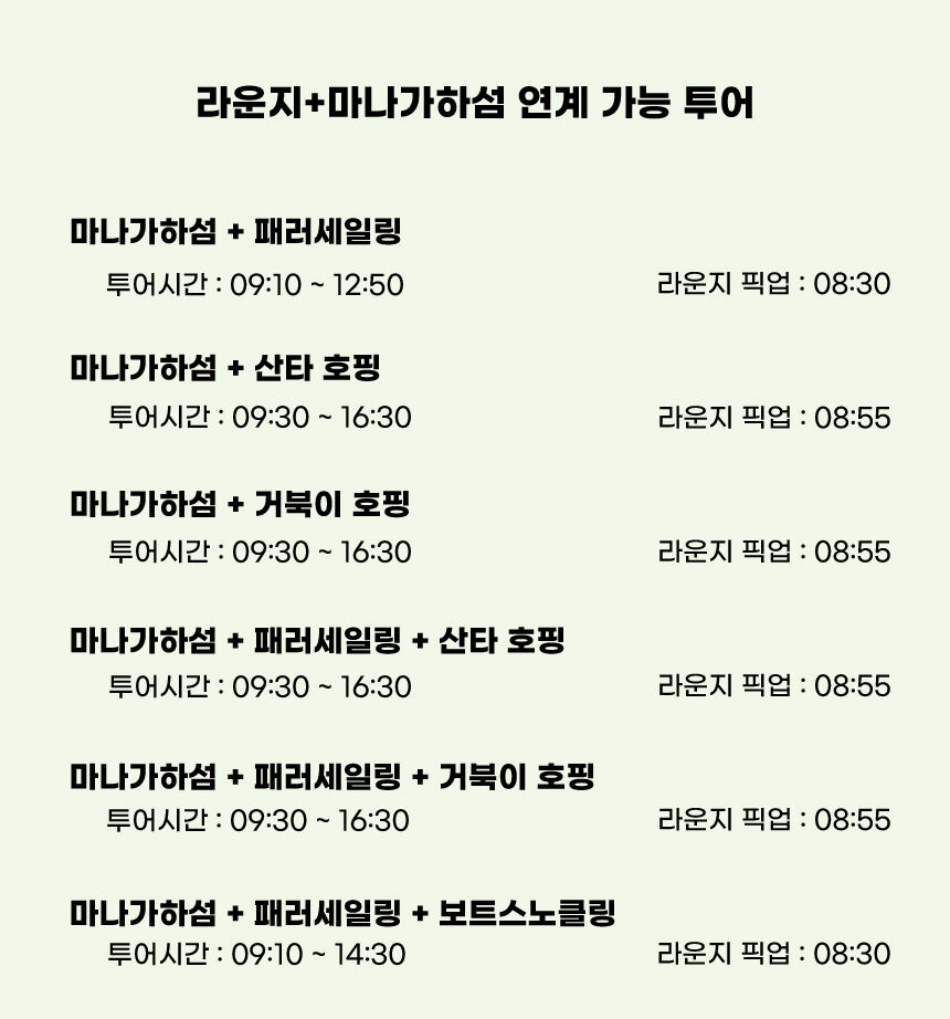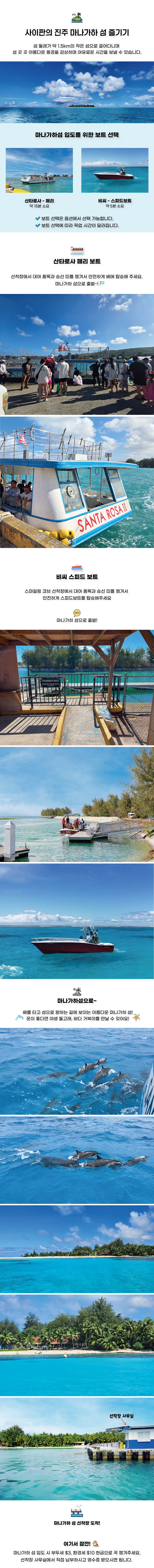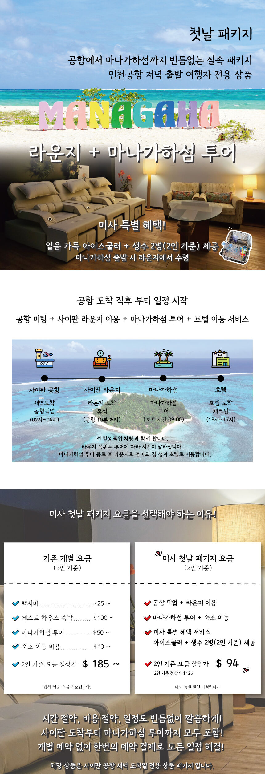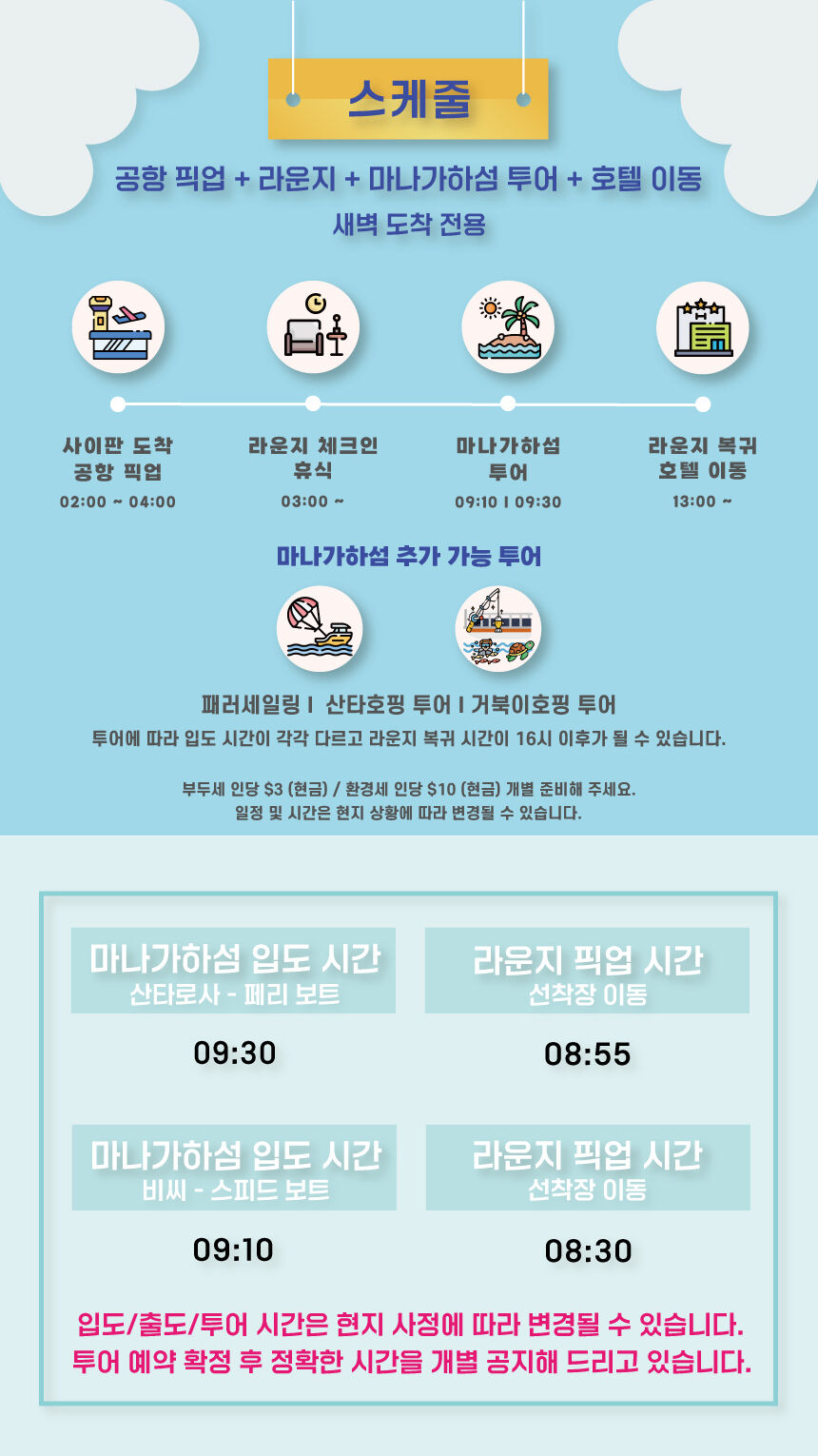 사이판 라운지 + 마나가하섬 투어 첫날 패키지(인천공항 저녁 출발 여행자 전용 상품) 본문: 로컬 DB 동기화 상세 포함 - 공항 미팅 서비스(픽업) - 사이판 라운지 이용권 - 마나가하섬 왕복 페리/스피드보트 탑승권 - 호텔 이동 서비스(드랍) 불포함 - 사이판 라운지 샤워(유료 $5) - 마나가하섬 입도 시 부두세 인당 $3 현금 현장 결제 환경세 인당 $10 현금 현장 결제 마이리얼트립에서 예약하기 인천 목록 도시 목록