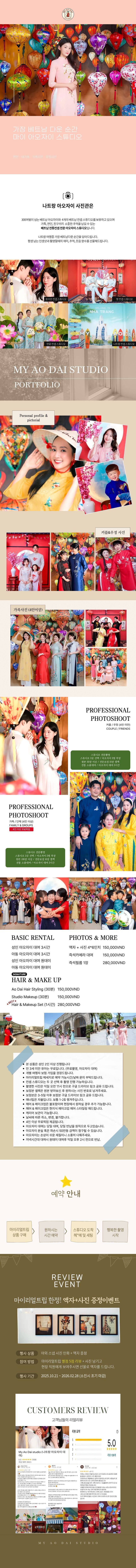 [단독할인] 나트랑 아오자이 사진관 (가족사진, 컨셉촬영, 기념사진) 평점 5 · 리뷰 26건 포함 기본 대여 아오자이 대여 3시간 + 포토존 셀프 촬영 아오자이 대여 하루 + 포토존 셀프 촬영 포토그래퍼 전문 촬영 아오자이 대여 3시간 + 스튜디오 (택 2) 전문 촬영 원본 50장 이상 + 보정본 10장 셀렉 불포함 픽업, 샌딩 현지식 헤어&메이크업 (현장추가 가능) 여행자 보험 *개별 여행자 보험 가입을 권장 드립니다. 마이리얼트립에서 예약하기 나트랑 목록 도시 목록
