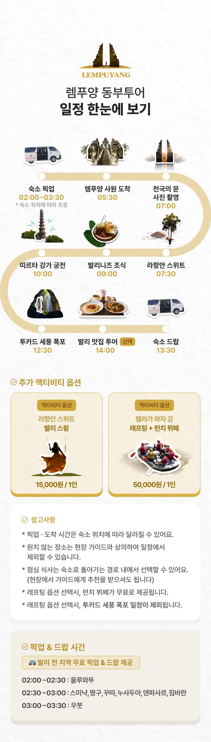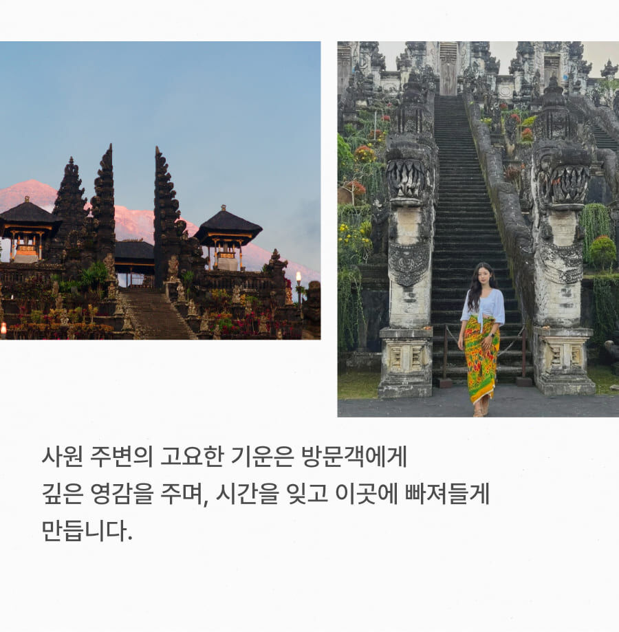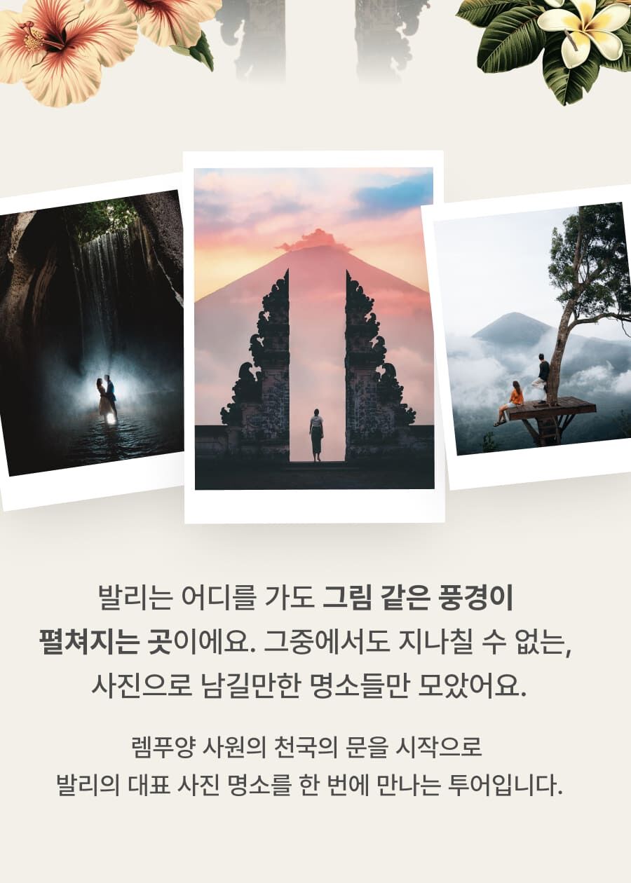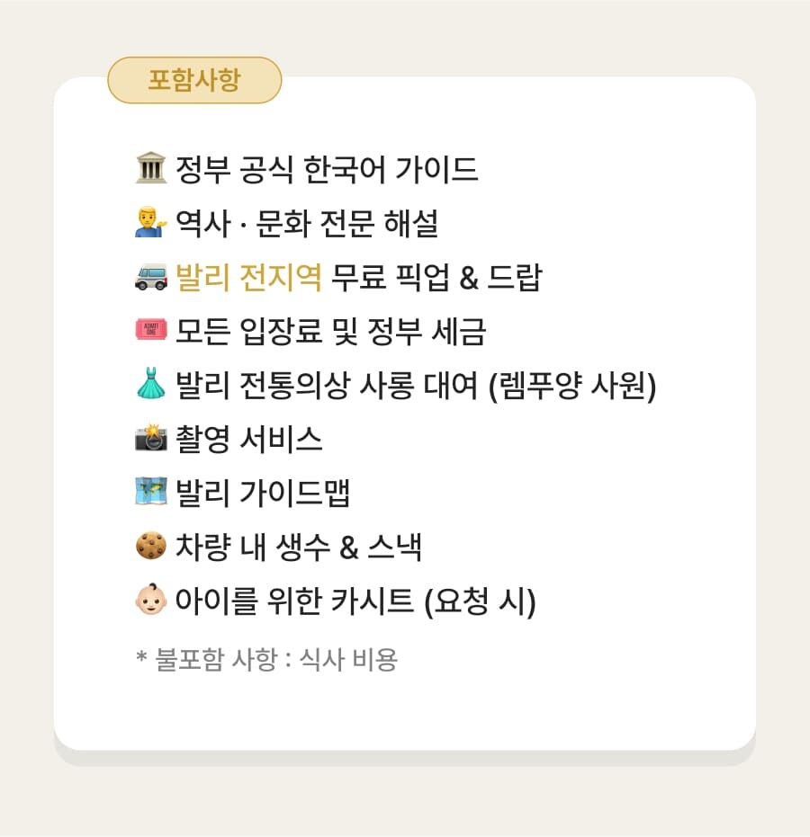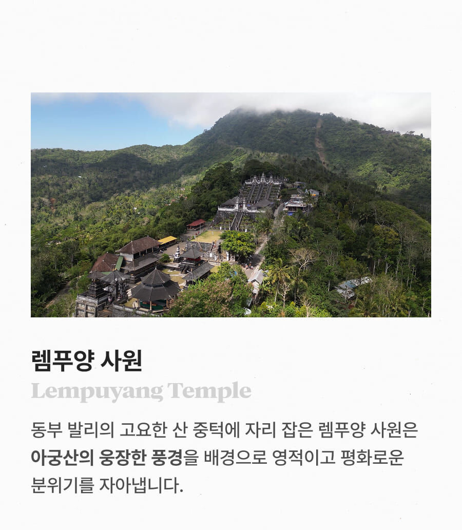 [단독이벤트/로컬페이지] 발리 렘푸양 동부투어 (천국의 문/전지역 무료픽드랍/한국어가이드) 평점 5 · 리뷰 6건 포함 1. 발리 전지역 무료 픽업&드랍 서비스 2. 정부 공식 한국어 가이드 3. 최대 10시간 차량 이용 4. 모든 입장료 및 정부세금 5. 365 여행 상담원 6. 촬영 서비스 7. 발리 가이드맵 8. 발리 전통의상 세롱 대여 불포함 ﹒중식비용 ﹒선택 추가 옵션비용 (폭포 레프팅 + 런치뷔페 인당 50,000원 ) 마이리얼트립에서 예약하기 발리 목록 도시 목록