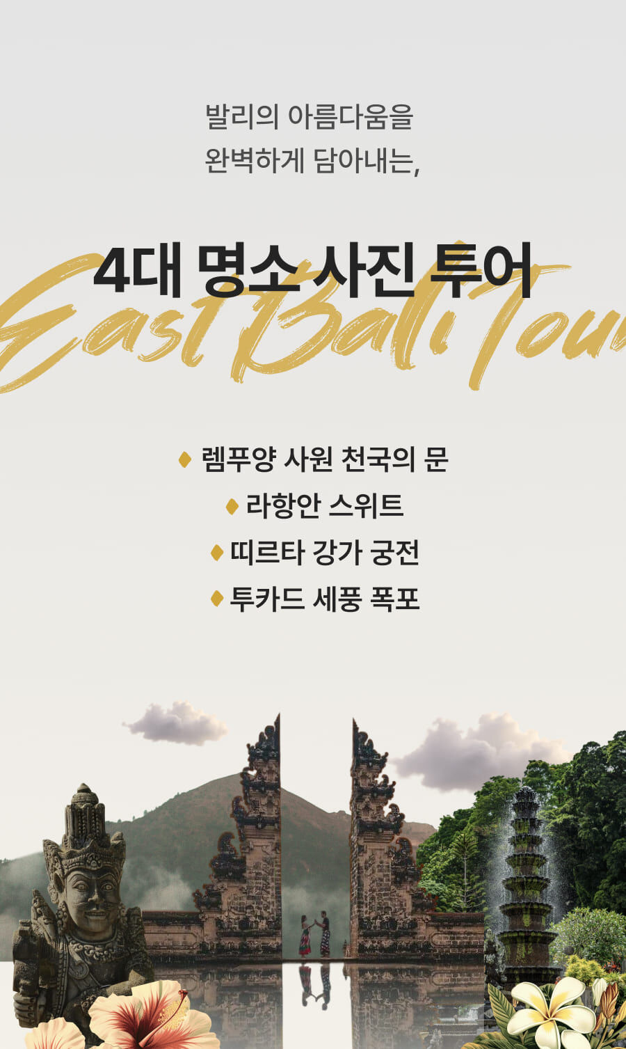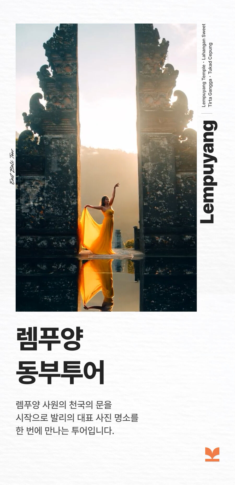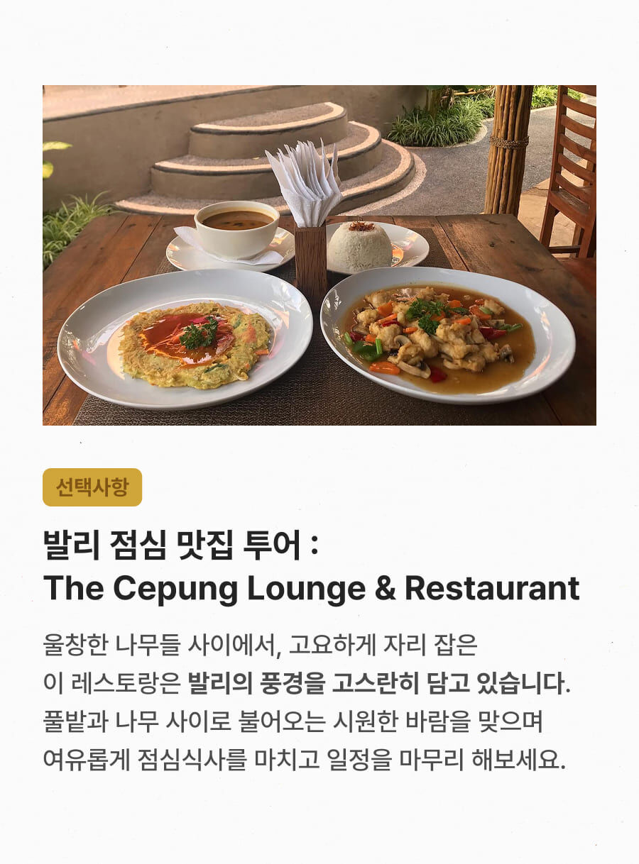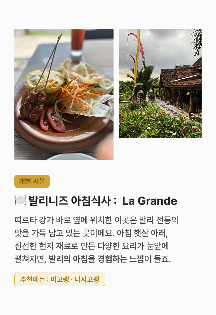 [단독이벤트/로컬페이지] 발리 렘푸양 동부투어 (천국의 문/전지역 무료픽드랍/한국어가이드) 평점 5 · 리뷰 6건 포함 1. 발리 전지역 무료 픽업&드랍 서비스 2. 정부 공식 한국어 가이드 3. 최대 10시간 차량 이용 4. 모든 입장료 및 정부세금 5. 365 여행 상담원 6. 촬영 서비스 7. 발리 가이드맵 8. 발리 전통의상 세롱 대여 불포함 ﹒중식비용 ﹒선택 추가 옵션비용 (폭포 레프팅 + 런치뷔페 인당 50,000원 ) 마이리얼트립에서 예약하기 발리 목록 도시 목록