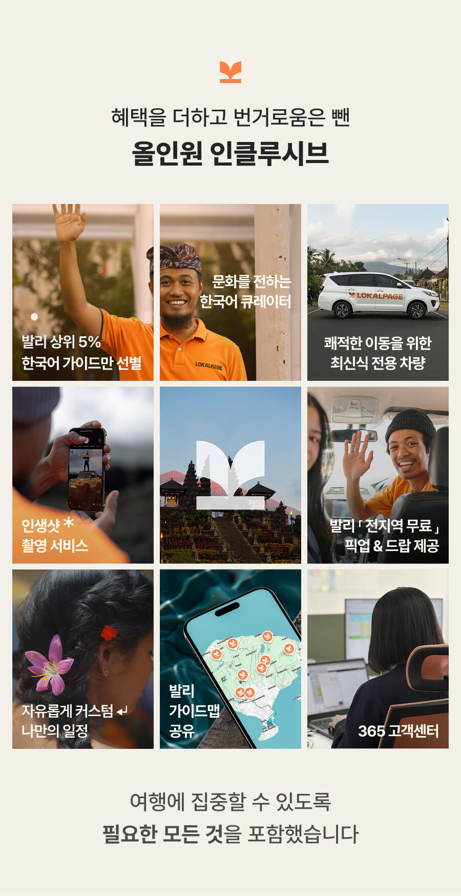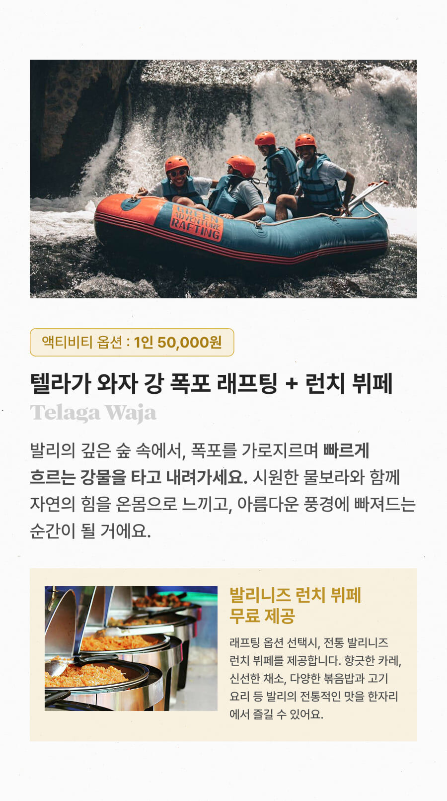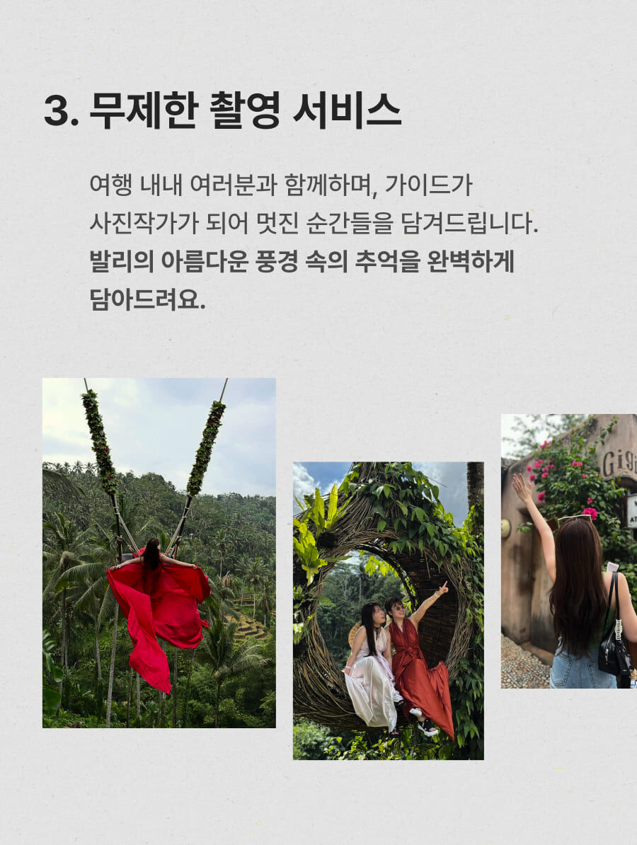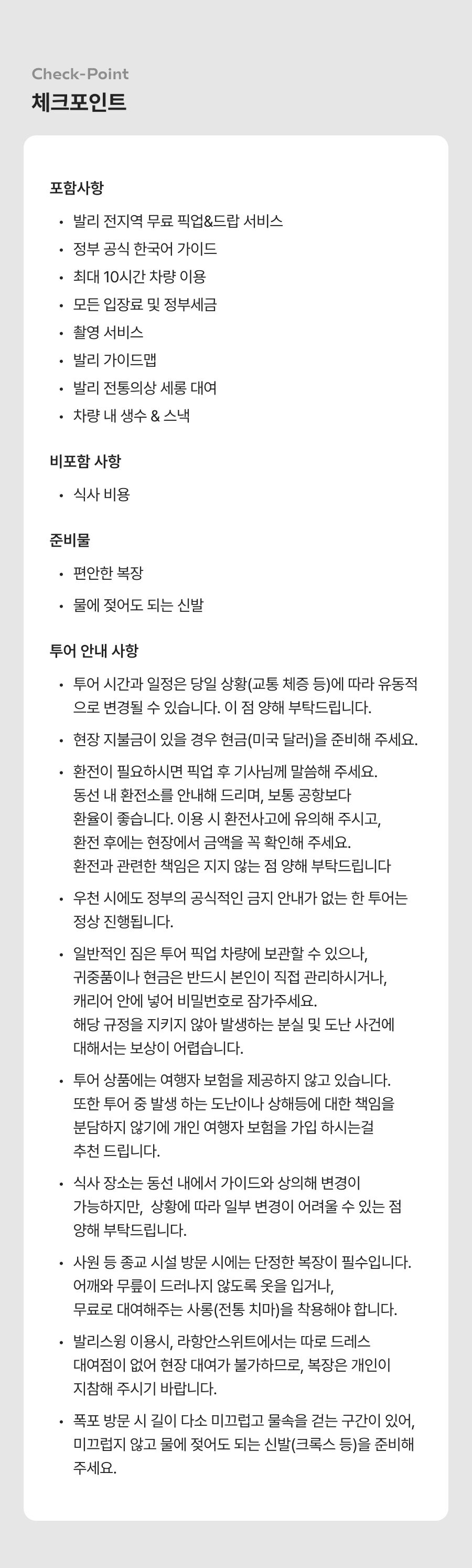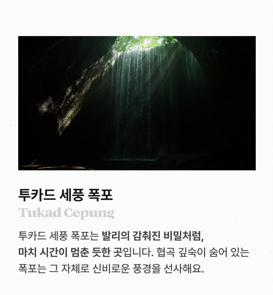[단독이벤트/로컬페이지] 발리 렘푸양 동부투어 (천국의 문/전지역 무료픽드랍/한국어가이드) 평점 5 · 리뷰 6건 포함 1. 발리 전지역 무료 픽업&드랍 서비스 2. 정부 공식 한국어 가이드 3. 최대 10시간 차량 이용 4. 모든 입장료 및 정부세금 5. 365 여행 상담원 6. 촬영 서비스 7. 발리 가이드맵 8. 발리 전통의상 세롱 대여 불포함 ﹒중식비용 ﹒선택 추가 옵션비용 (폭포 레프팅 + 런치뷔페 인당 50,000원 ) 마이리얼트립에서 예약하기 발리 목록 도시 목록
