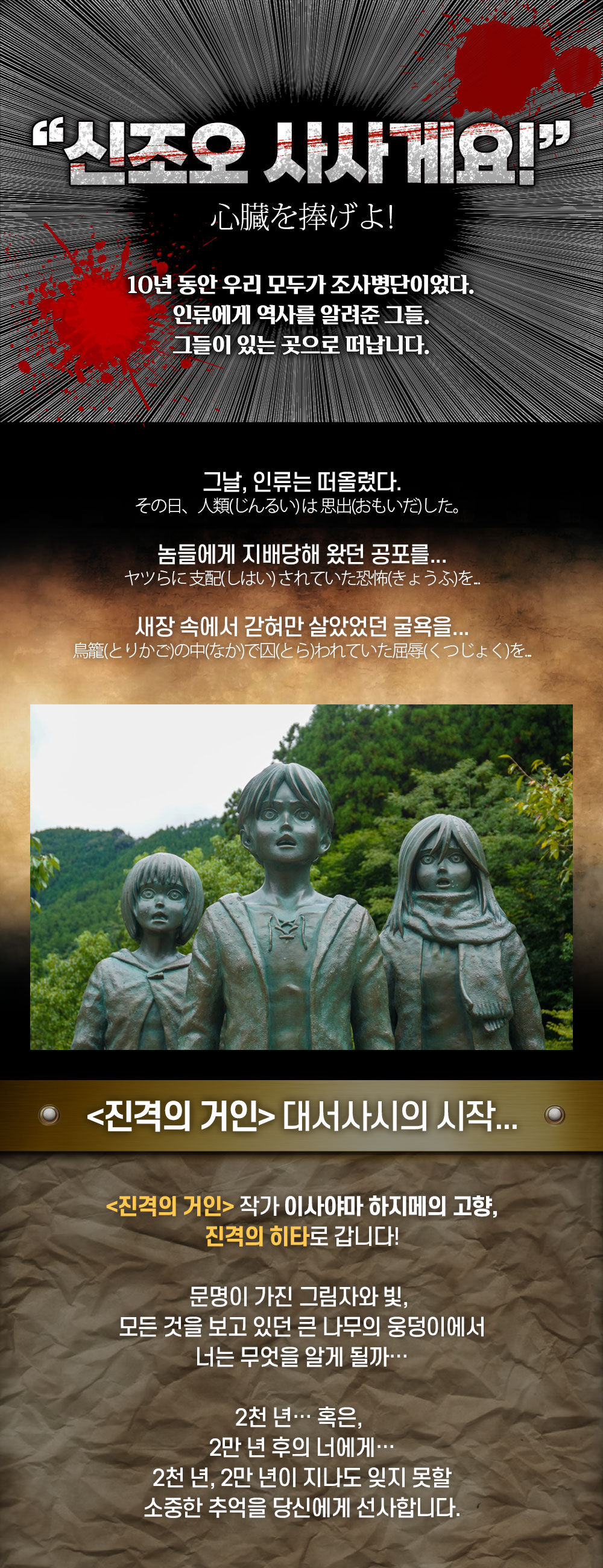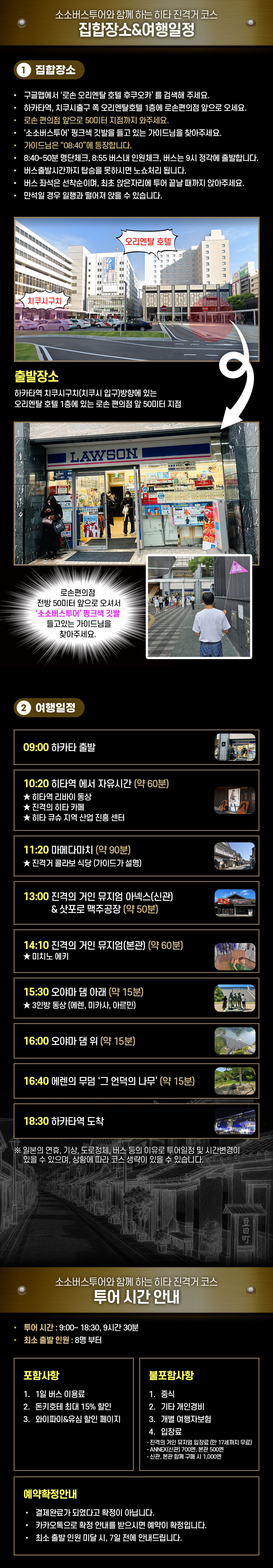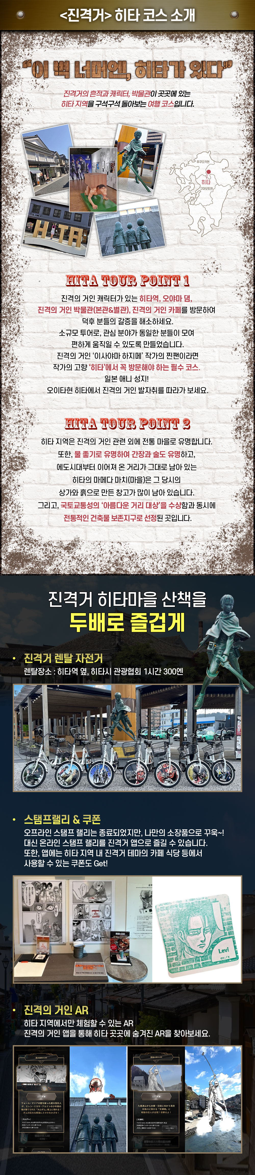 [히타성지순례] 후쿠오카 히타 진격의거인 뮤지엄 오야마댐 히타역 일일 버스투어 소소버스 평점 4.96875 · 리뷰 32건 포함 1일 버스투어 이용료 히타 자체제작 지도 돈키호테 최대 15% 할인 와이파이&유심 할인 페이지 불포함 중식 기타 개인경비 개별 여행자보험 입장료 -진격의 거인 뮤지엄 입장료 (만 17세까지 무료) -ANNEX(신관) 700엔, 본관 500엔 -신관, 본관 함께 구매 시 1,000엔 마이리얼트립에서 예약하기 후쿠오카 목록 도시 목록