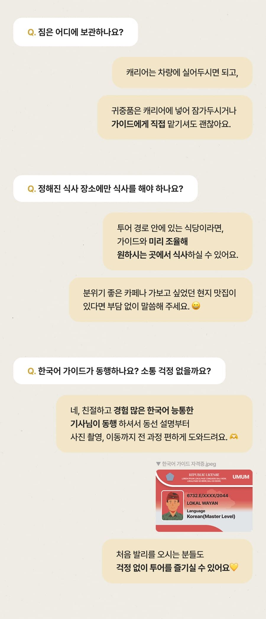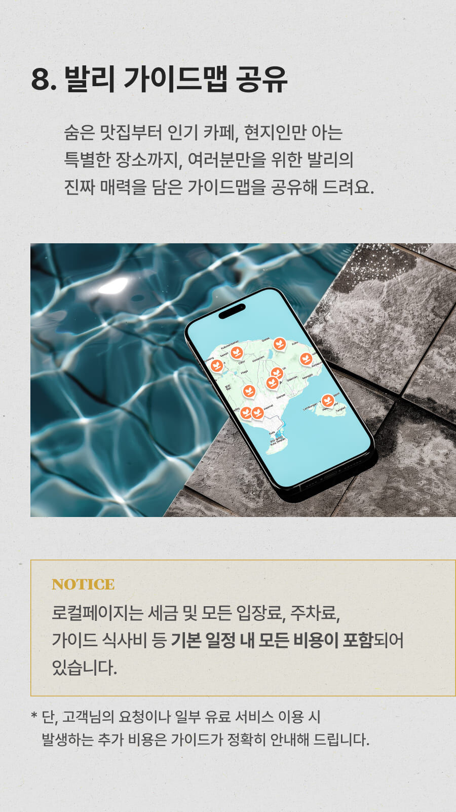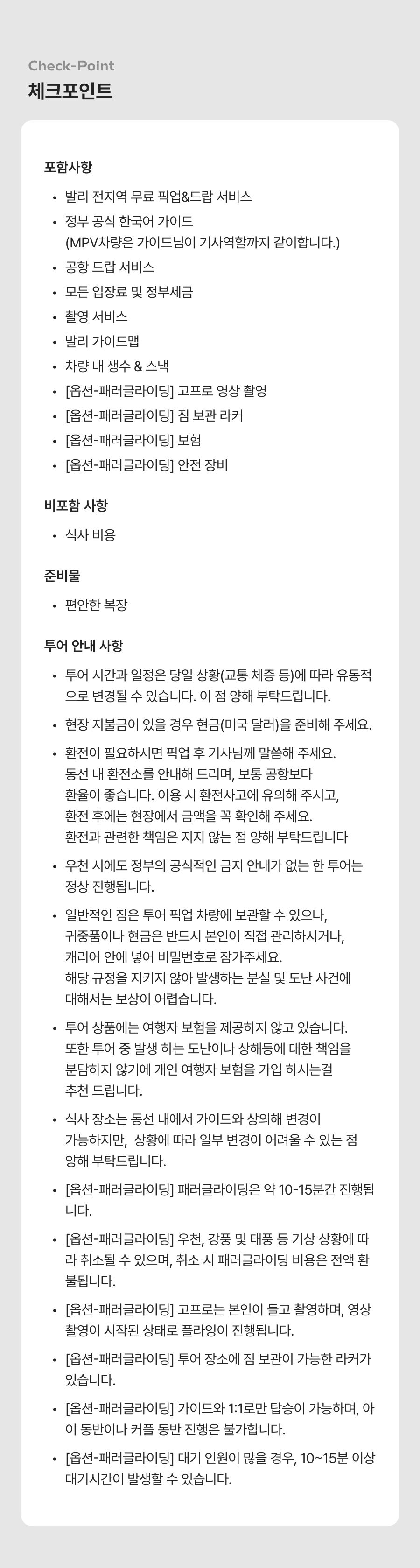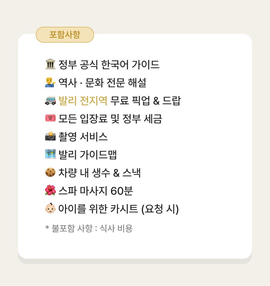 - ﹒ 발리 전지역 무료 픽업&드랍 서비스 ﹒ 정부 공식 한국어 가이드 ﹒ 최대 10시간 차량 이용 ﹒ 모든 입장료 및 정부세금 ﹒ 365 여행 상담원 ﹒ 촬영 서비스 ﹒ 발리 가이드맵 ﹒ 차량 내 생수 및 스낵 제공 ﹒ 기본 마사지 60분 포함