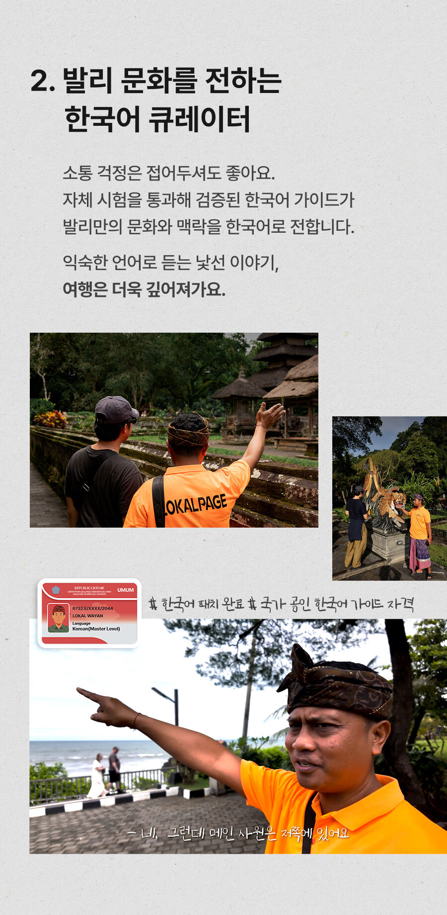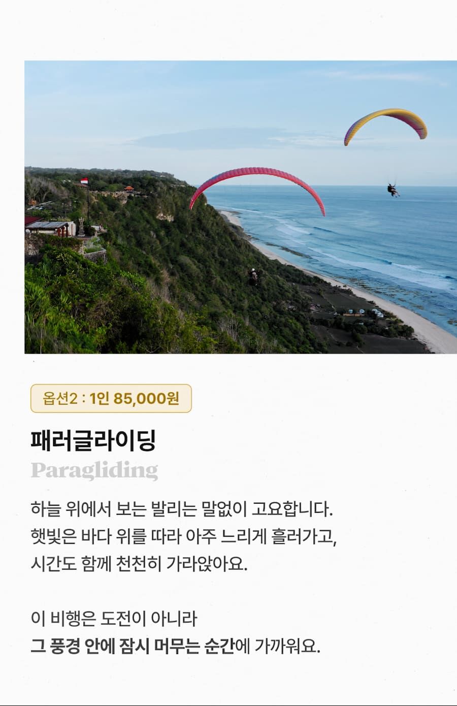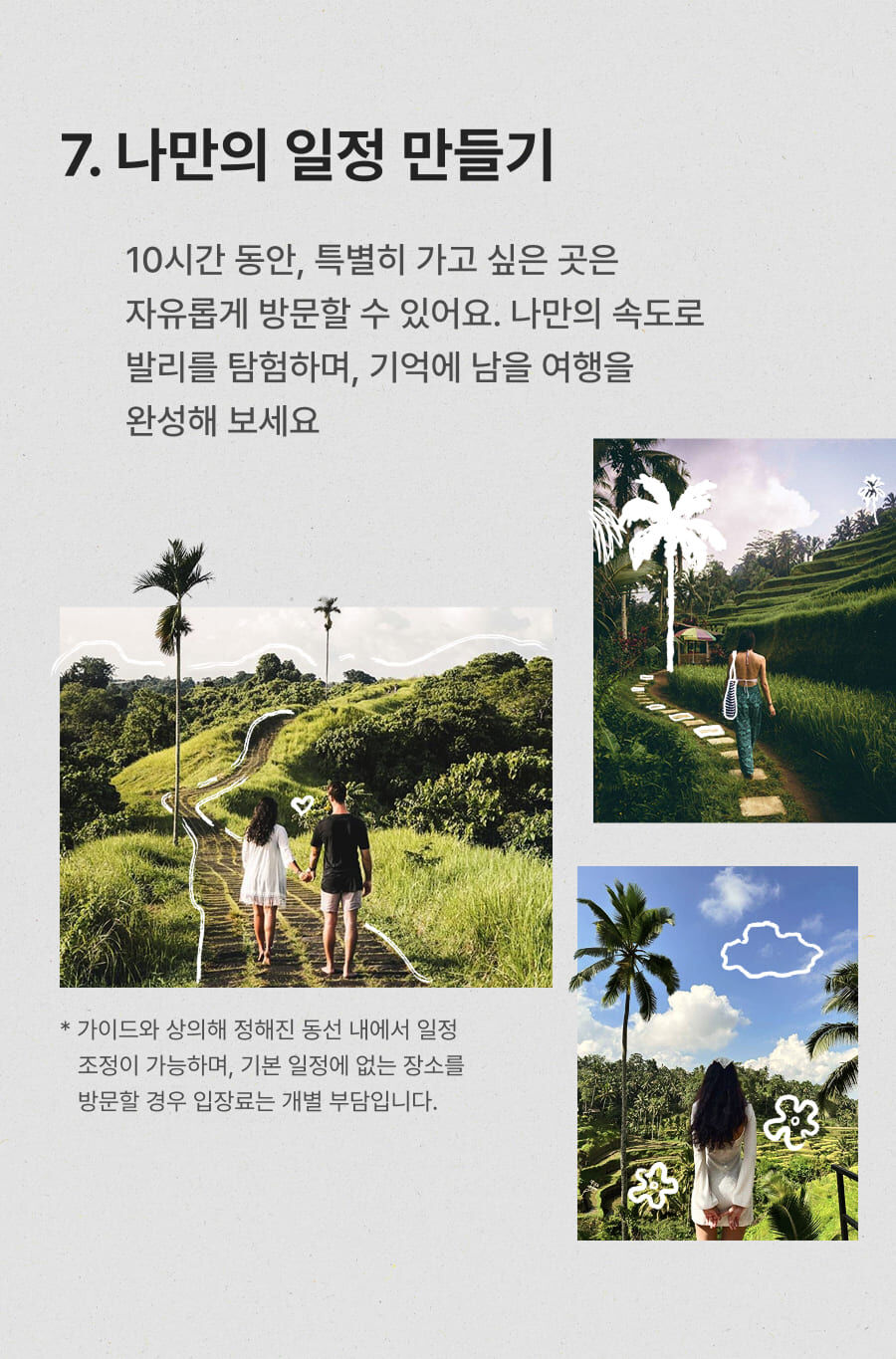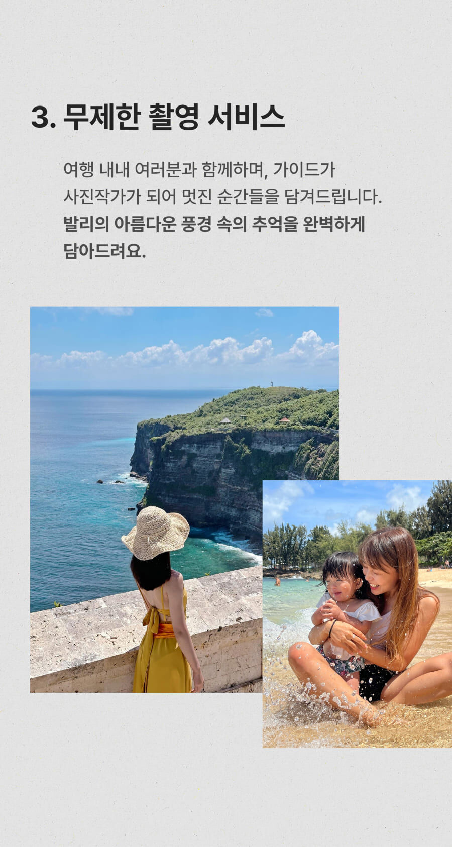 - ﹒ 발리 전지역 무료 픽업&드랍 서비스 ﹒ 정부 공식 한국어 가이드 ﹒ 최대 10시간 차량 이용 ﹒ 모든 입장료 및 정부세금 ﹒ 365 여행 상담원 ﹒ 촬영 서비스 ﹒ 발리 가이드맵 ﹒ 차량 내 생수 및 스낵 제공 ﹒ 기본 마사지 60분 포함