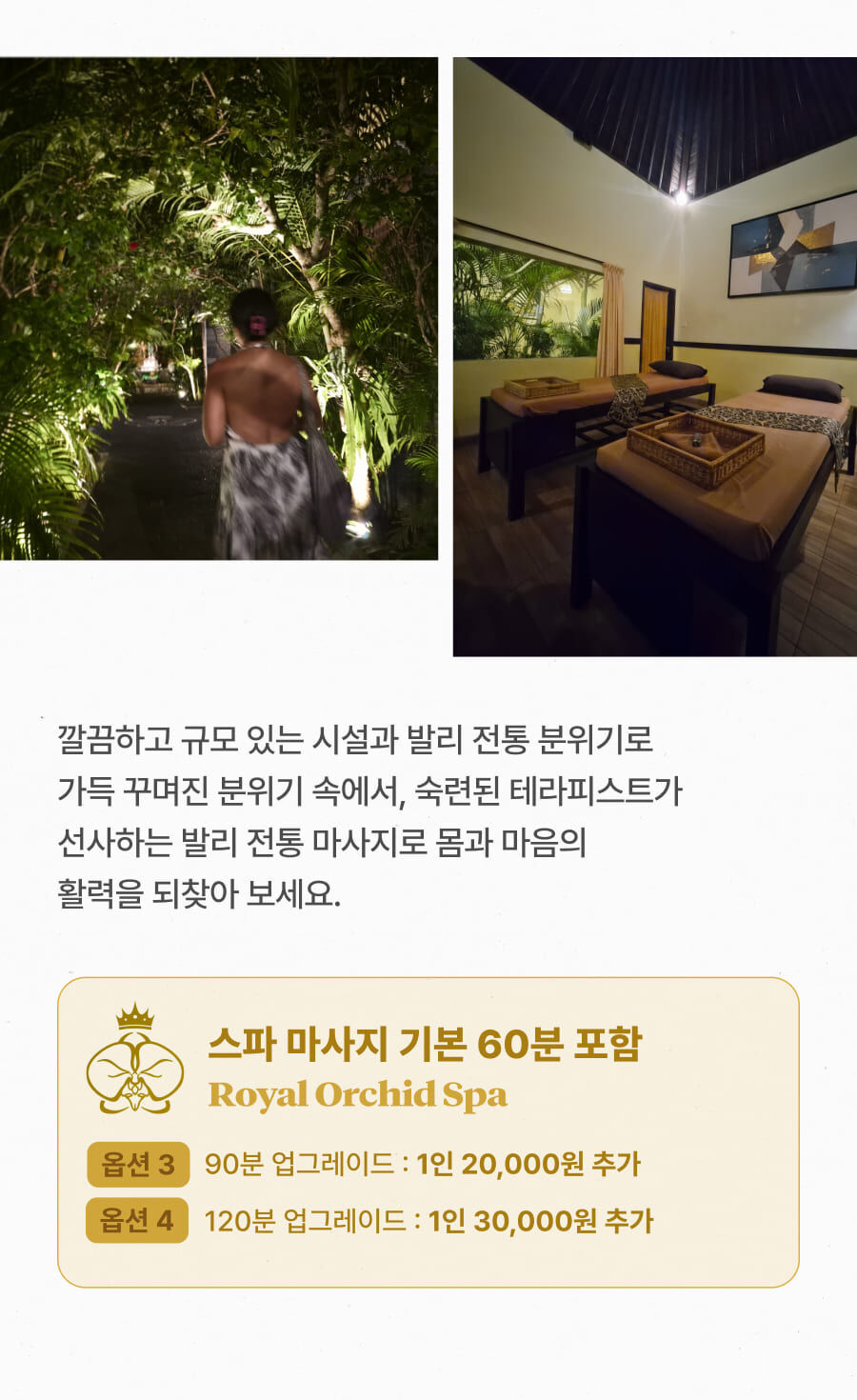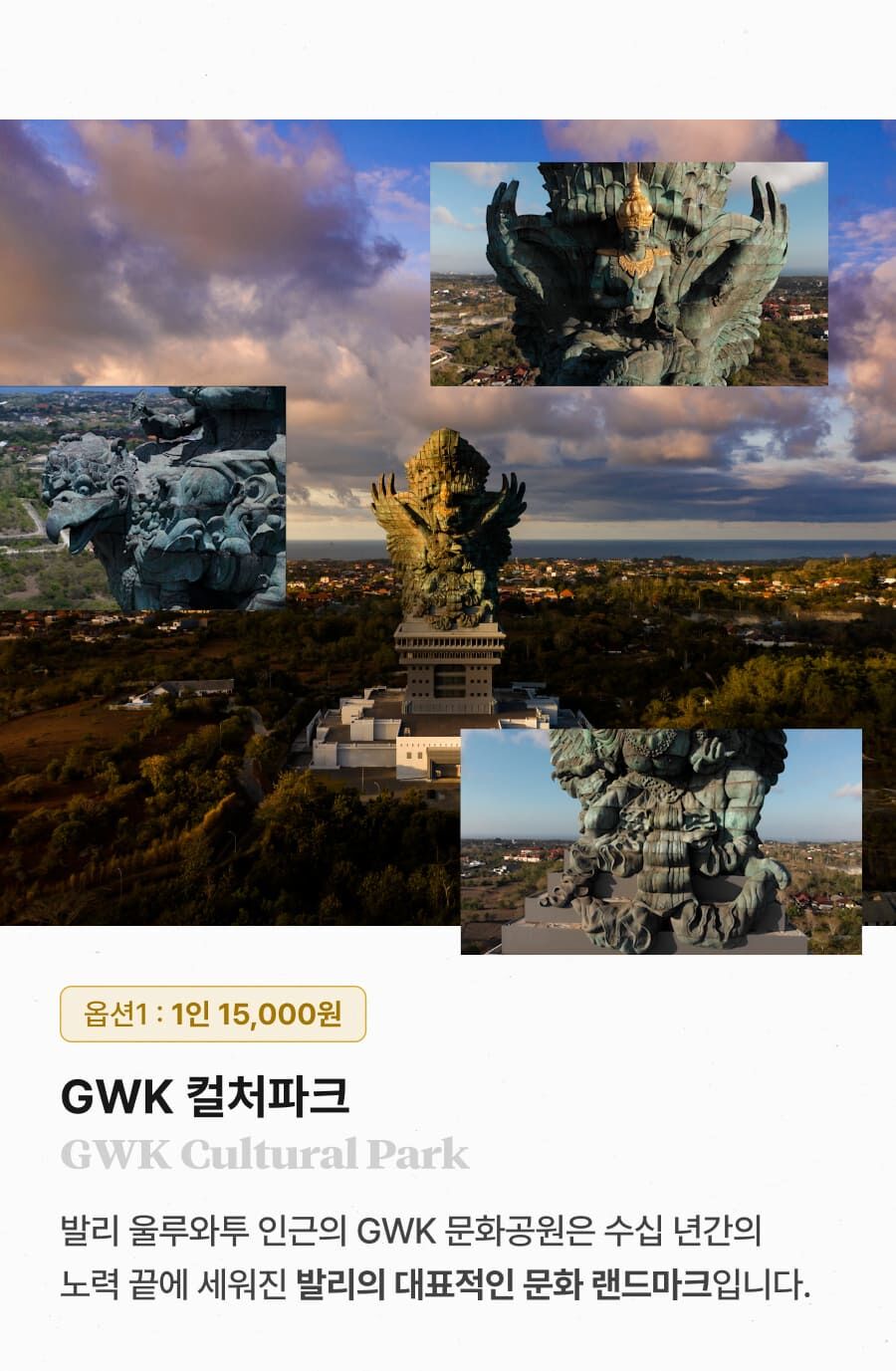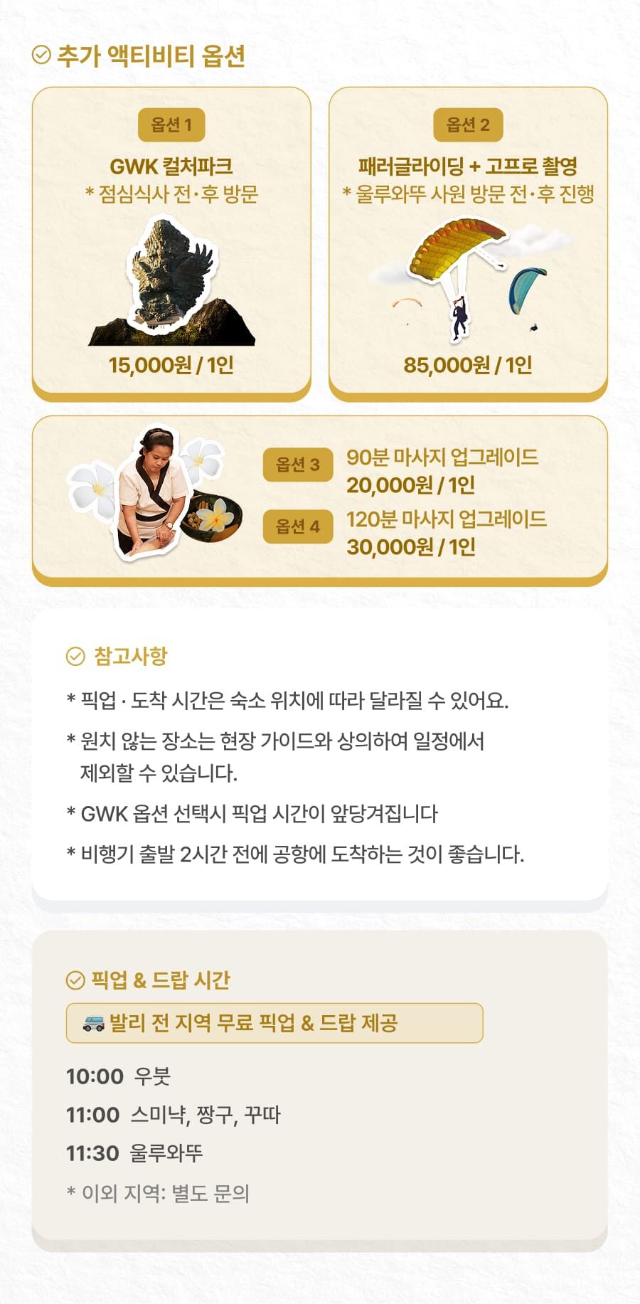 - ﹒GWK 컬처파크 방문 비용 1인 15,000원 (옵션 선택가능) ﹒마사지 시간 업그레이드 비용 (옵션 선택가능) ﹒식사 비용