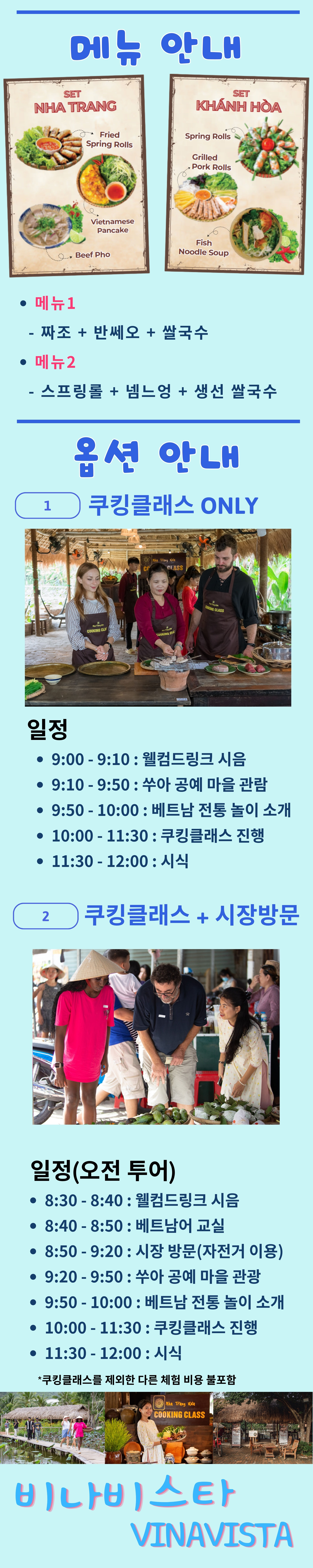 - 쿠킹클래스 재료비 및 식사 / 쑤아 공예마을 입장료 / 한국어 지원 - 베트남 로컬 직원 / 웰컴 드링크 / 마켓 투어 시 - 자전거 대여료 ※ 메뉴 선택 없이 아래 단일 메뉴로 진행 됩니다 = 쿠킹 클래스 메뉴 = -> 소고기 쌀국수 / 반쎄오 / 스프링 롤
