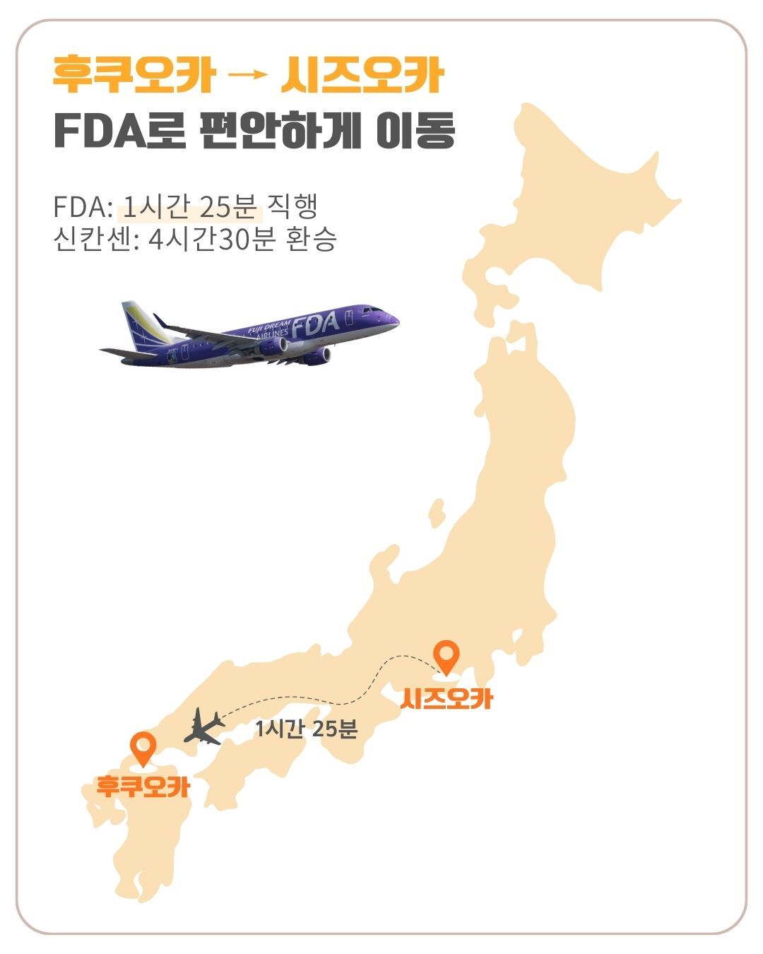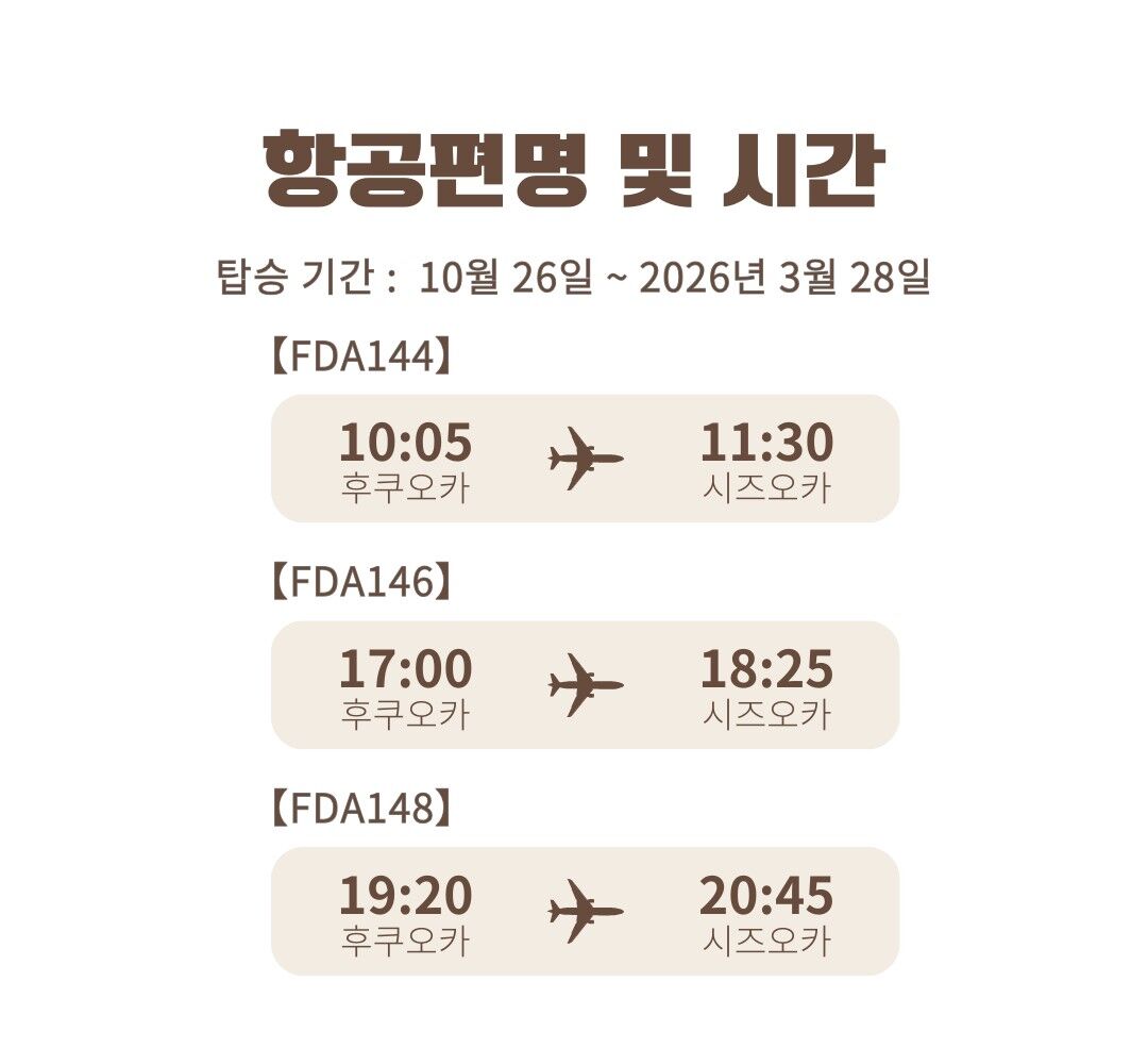 [일본국내선] 후쿠오카 -> 시즈오카 항공권 후지드림항공 편도 포함 유류할증료, 텍스 포함 전석 이코노미 좌석 위탁수하물 1인 20kg까지 비행중 1회 음료 / 제과 제공 불포함 포함사항 이외 모든 제반사항 마이리얼트립에서 예약하기 시즈오카 목록 도시 목록