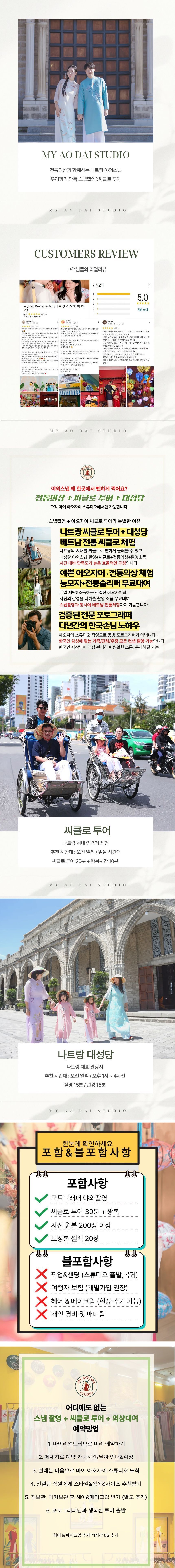 [나트랑 스냅/아오자이 스냅] 나트랑 씨클로 투어 아오자이 스냅촬영 평점 5 · 리뷰 1건 포함 전통의상 대여 3시간 포토그래퍼 야외촬영 씨클로 투어 30분 + 왕복 사진 원본 200장 이상 (촬영 당일 저녁 혹은 익일 오전까지 메일로 보내드립니다.) 사진 보정본 20장 셀렉 (보정본 10장 선택 후 3-5일) 촬영소품 (농모자, 전통슬리퍼) 무료대여 불포함 개별 여행자 보험 매너팁 개인경비 헤어 & 메이크업 1시간 (8$추가) 마이리얼트립에서 예약하기 나트랑 목록 도시 목록