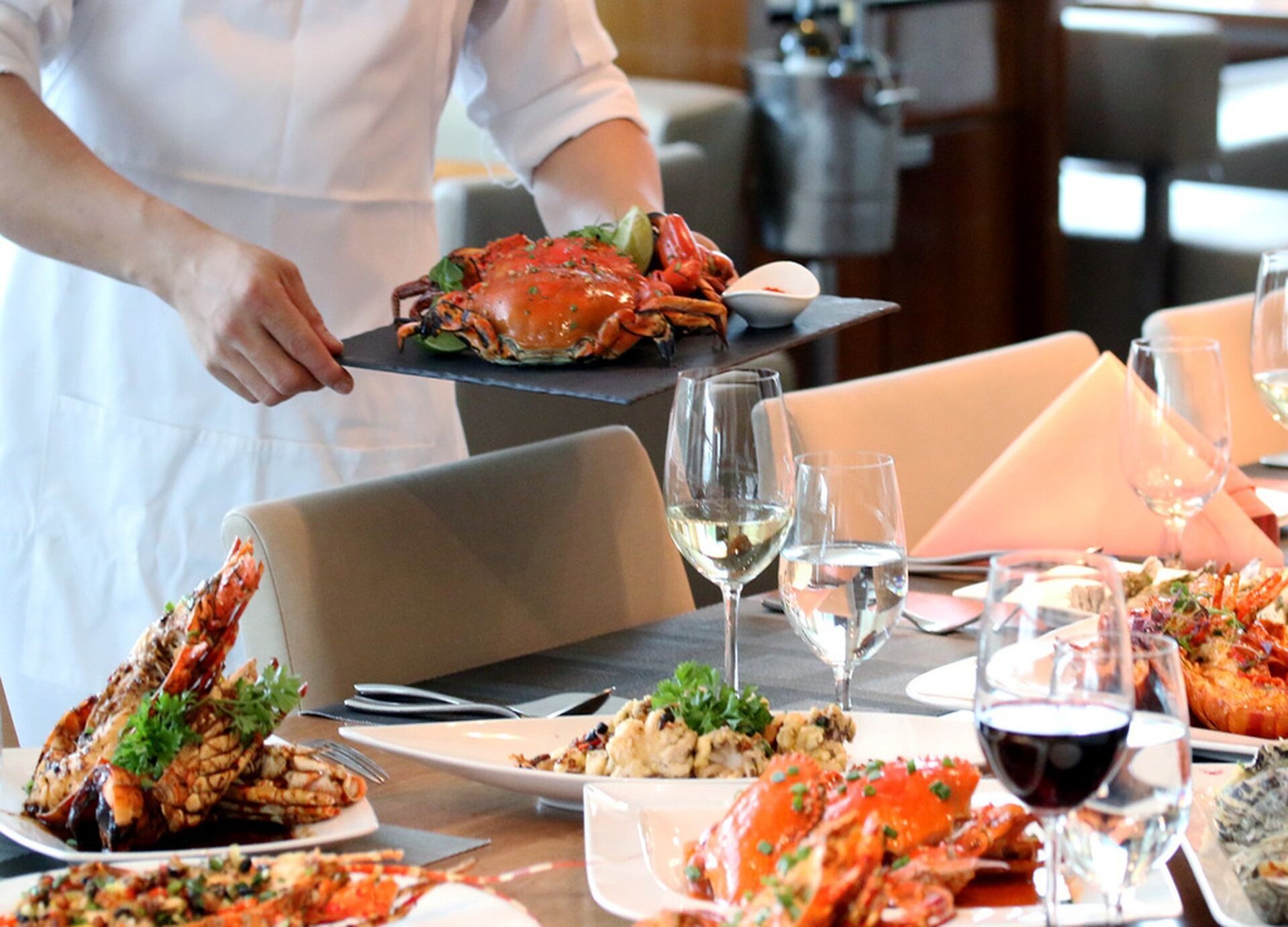 - • 다양한 종류의 씨푸드 • 랍스터, 신선한굴, 머드크랩, 블루크랩, 새우, 연어, 다양한 조개류, 스시 & 사시미를 포함한 다양한 부페 • 하우스와인, Cocktail of the day, 맥주, 탄산음료, 주스, 커피&티