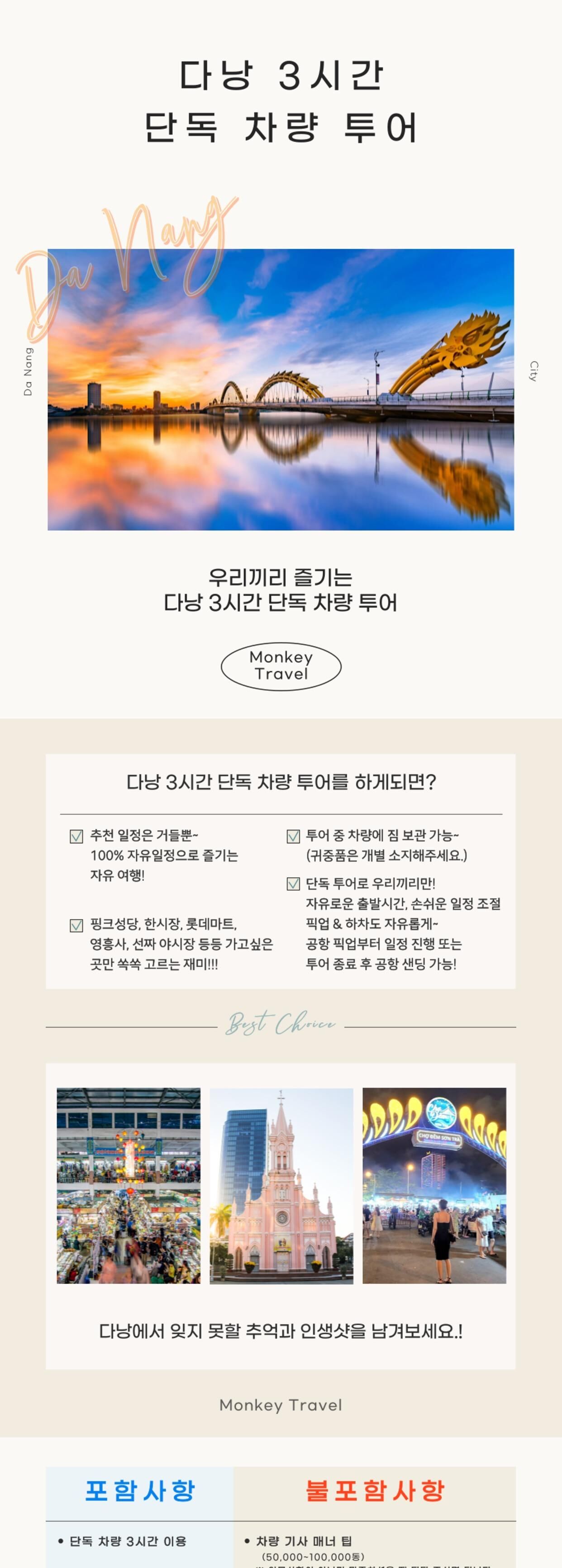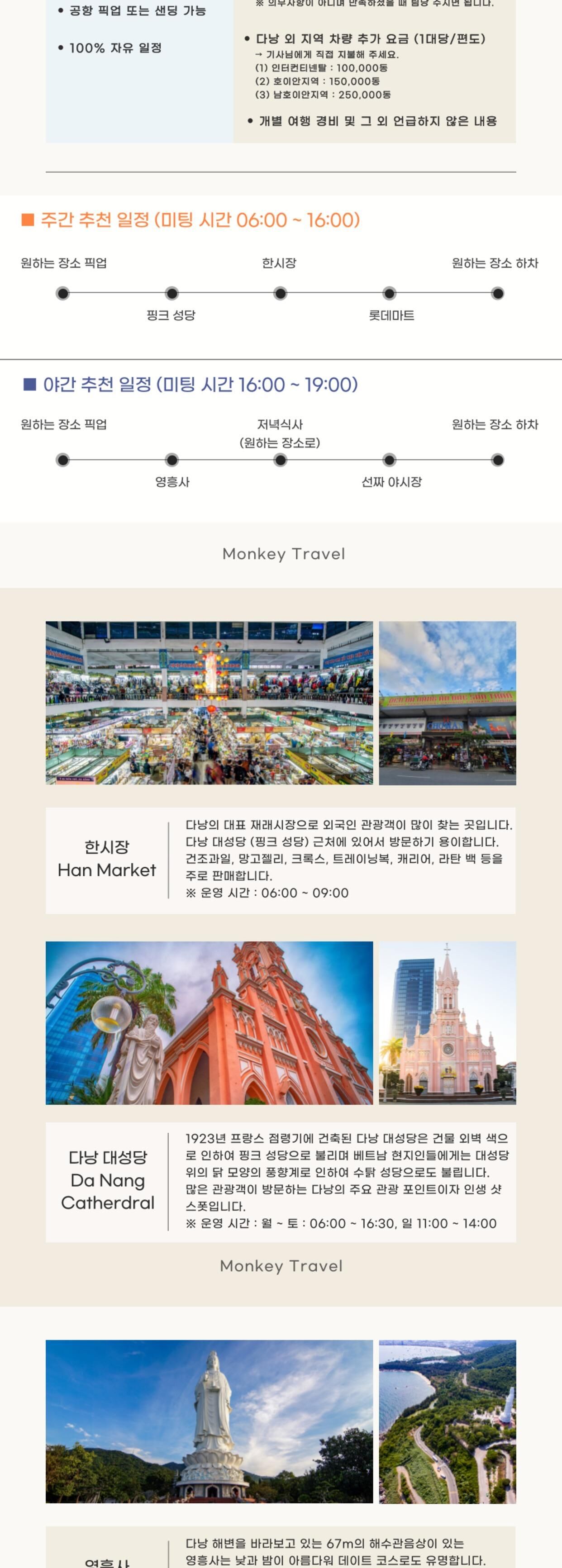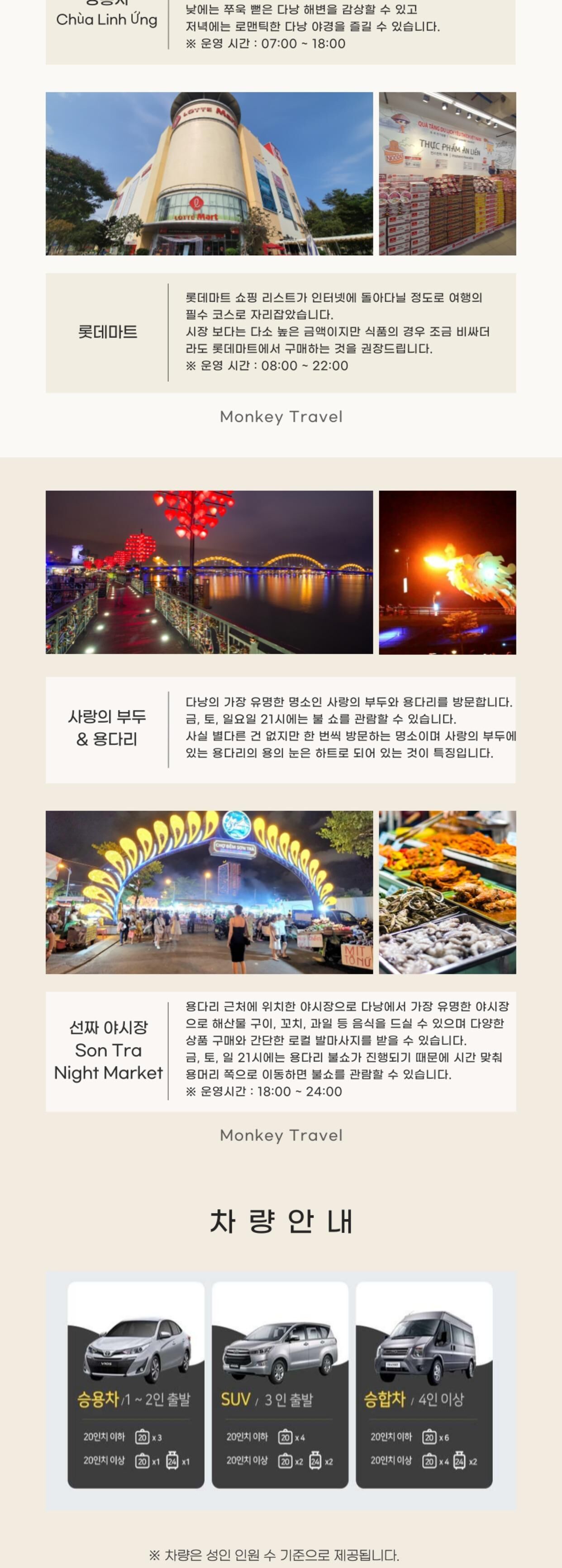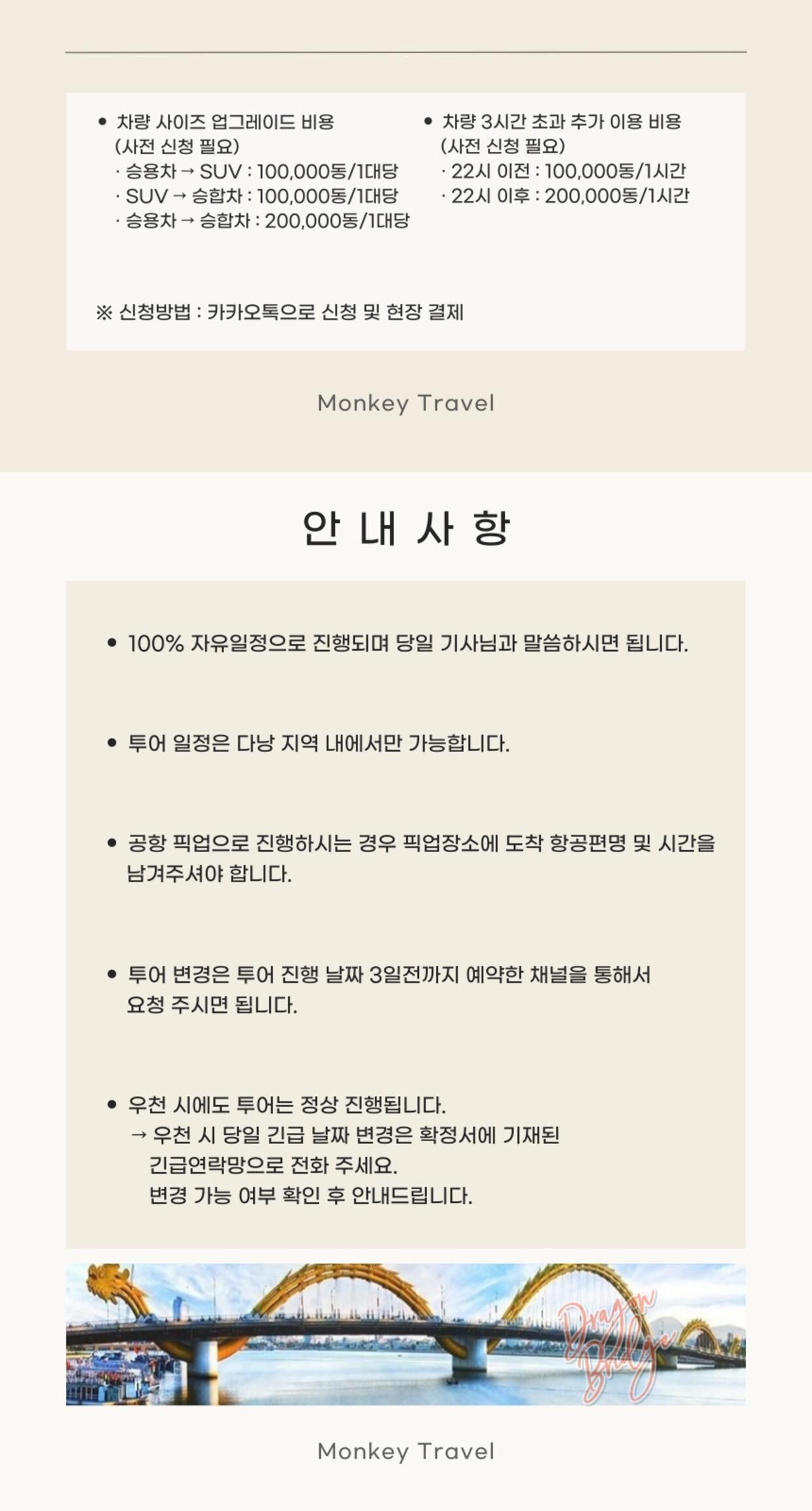 - • 개별여행경비 • 차량기사 매너팁 • 식사 불포함 • 다낭지역 시외지역 차량추가요금 (1대당/편도) → 기사분에게 직접 지불해주세요. (1) 인터컨티넨탈 : 10만동/편도/1대당 (2) 호이안지역 : 15만동/편도/1대당 (3) 남호이안지역 : 25만동/편도/1대당