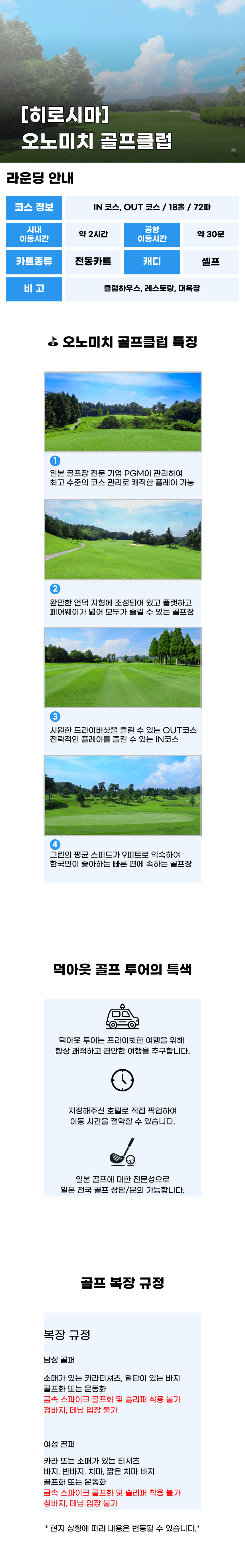 [히로시마 골프 투어] 오노미치 골프클럽 (PGM) 18홀 라운딩 (픽업 선택가능) 포함 카트피 그린피 락카피 차량비(차량 옵션 선택 시) 톨비(차량 옵션 선택 시) 가이드팁(차량 옵션 선택 시) 불포함 중식,석식,여행자보험,항공비,개별활 마이리얼트립에서 예약하기 히로시마 목록 도시 목록