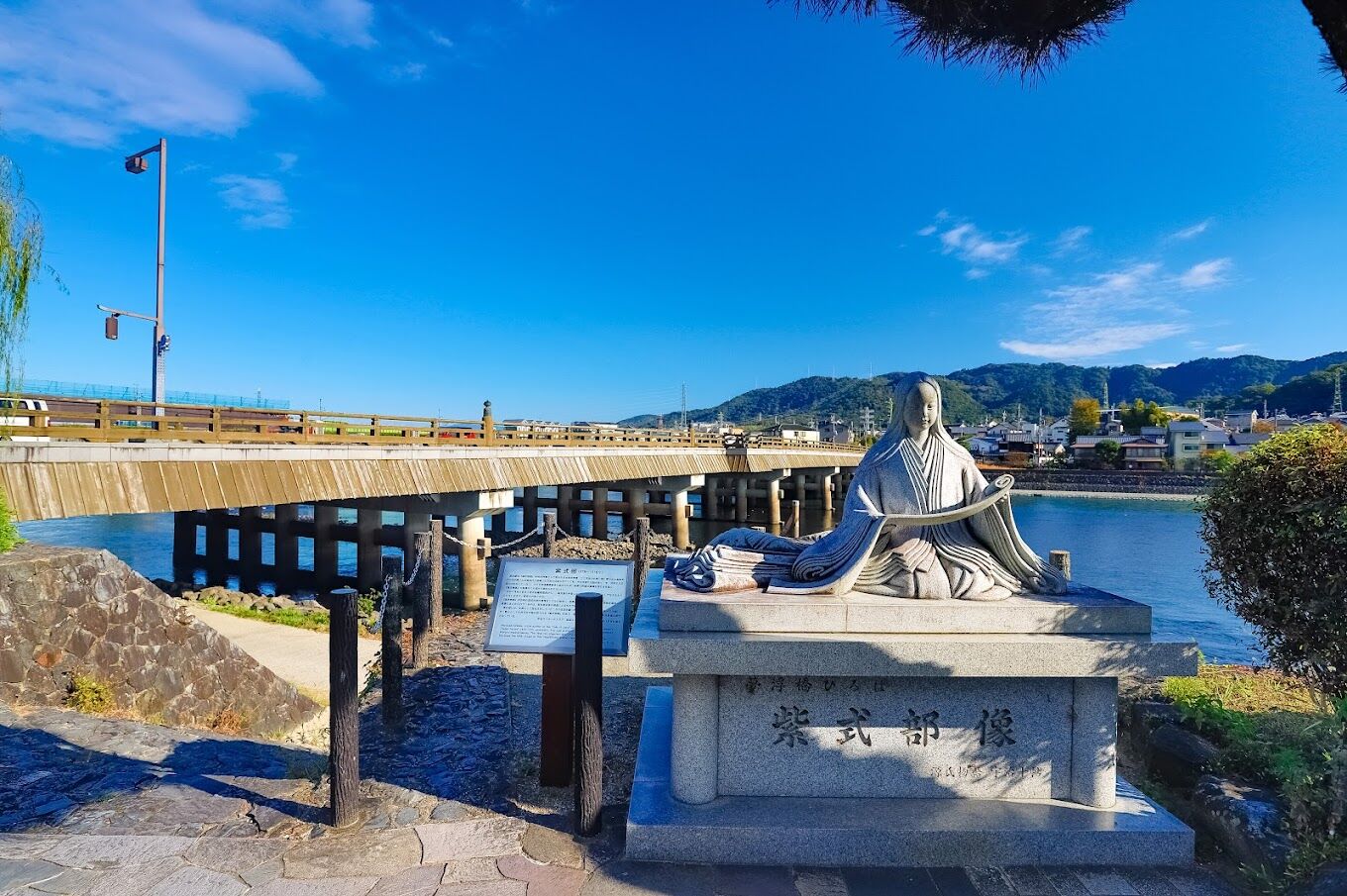 우지강을 따라가다 보면 무라사키 시키부 상도 만나볼 수 있습니다.무라사키 시키부 상은 일본 교토 우지의 평등원 근처에 세워진 동상으로, 『겐지모노가타리』의 저자이자 헤이안 시대를 대표하는 여성 작가 무라사키 시키부를 기념하기 위해 조성되었으며, 일본 고전 문학의 빛나는 업적을 상징합니다.