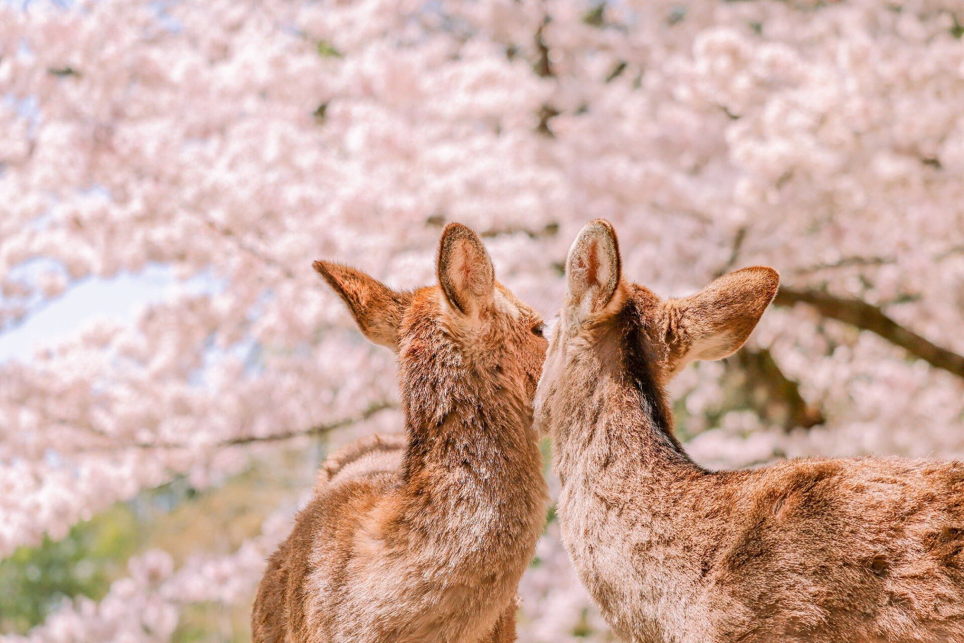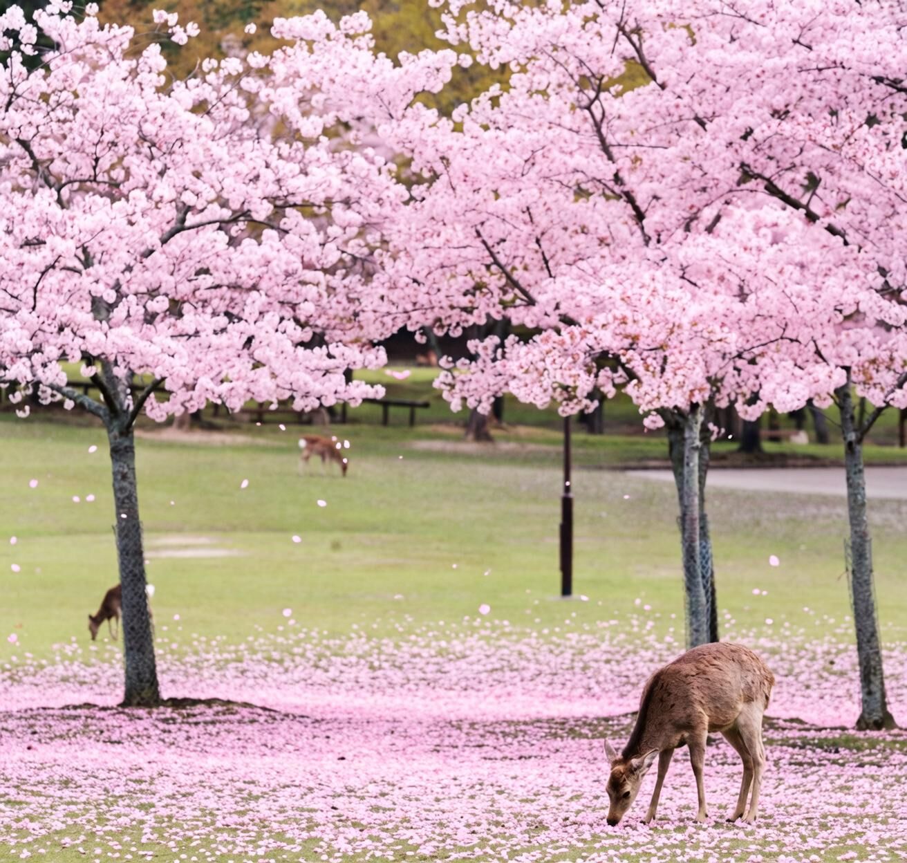 사슴 무리가 꽃비와 푸른 잔디 사이를 여유롭게 거닐며 꽃잎을 맡거나 방문객과 교감하는 모습은 마치 동화 속 한 장면 같습니다.