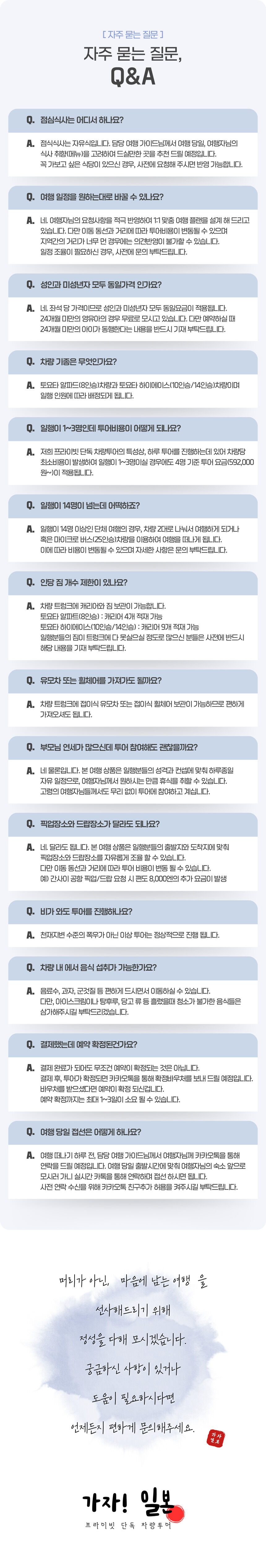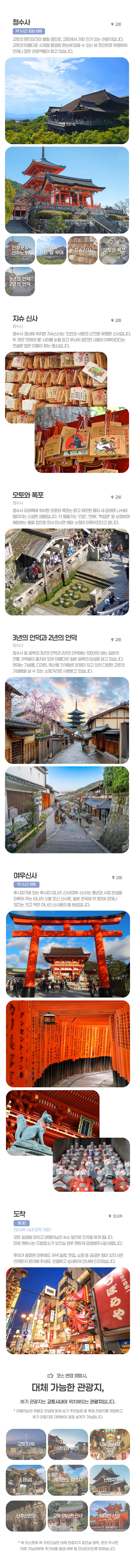 - ❌ 항공권과 숙박 ❌ 점심식사 비용 • 인당 약 1,500엔~ ❌ 관광지 입장료 • 산젠인/호센인 : 성인 700엔 / 소인 400엔 • 금각사/은각사 : 성인 500엔 / 소인 300엔 • 청수사 : 성인 500엔 / 소인 200엔 • 여우신사 : 무료 ❌ 개인 지출 비용 (간식, 쇼핑 등) ❌ 개별 여행자 보험 ⚠️ 간사이 공항 픽업/드랍 이용 시 편도 8,000엔의 추가비용이 발생됩니다. ⚠️ 일일 9시간 30분 기준으로 투어가 제공되며, 이후 1시간 초과시 5,000엔의 추가비용이 발생됩니다.