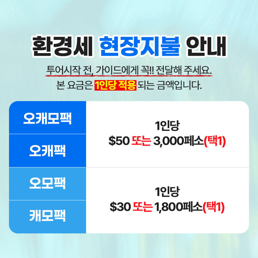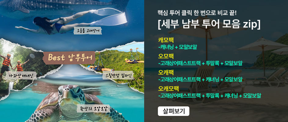 [스타일투어] 세부 오캐모팩 고래상어 투말록폭포 가와산캐녀닝 모알보알 원데이투어 평점 5 · 리뷰 3건 포함 여행자 보험 픽업/샌딩 (세부/막탄/공항 어디든 가능) 고래상어 왓칭 패스트트랙 안전장비 조식 중식 고프로 무료 대여 및 촬영 가이드 차량 및 기사님 이트래블 무료대행 불포함 환경세(오슬롭,투말록,가와산,모알보알) / $50 또는 3000페소 중 택1 (가이드님께 현장지불) 매너팁 캐녀닝 짚라인 1인 600페소 개별결제 마이리얼트립에서 예약하기 세부 목록 도시 목록