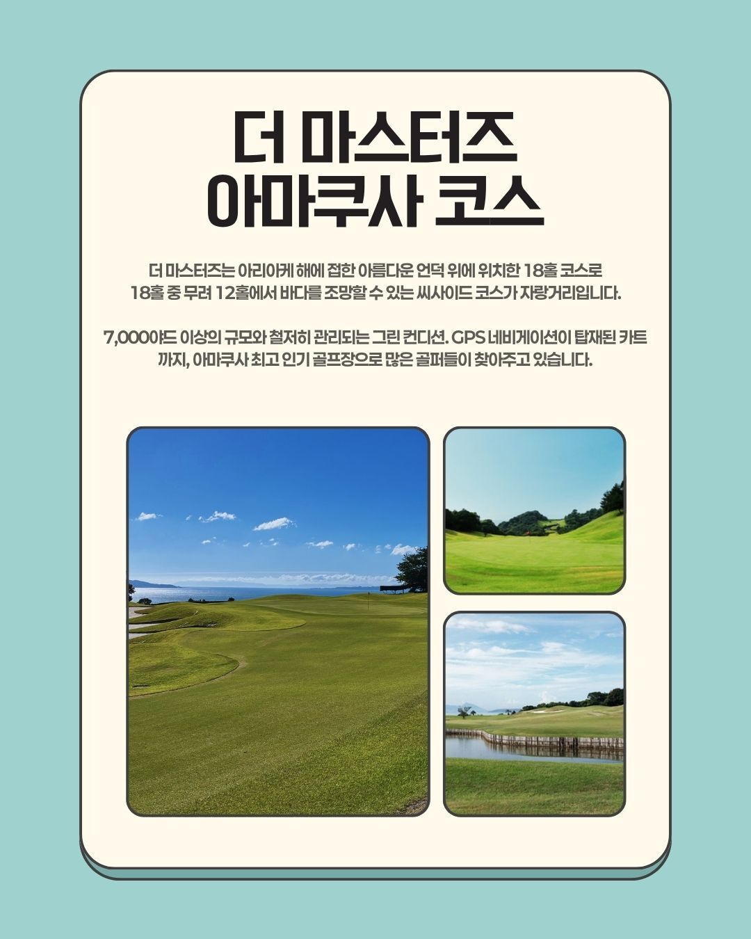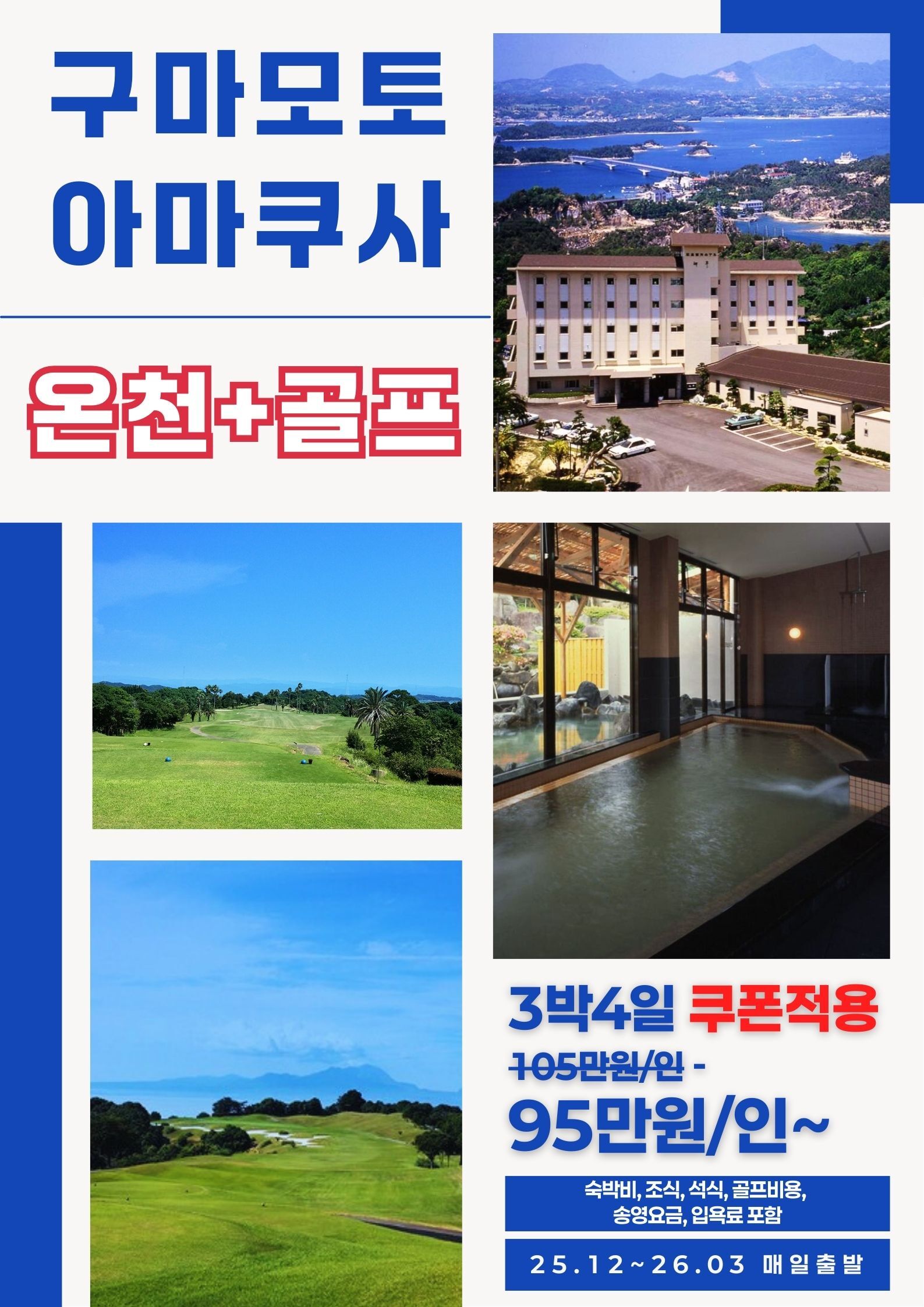 ★쿠폰적용 (매일출발,온천호텔) 일본 구마모토 아마쿠사 2색 온천골프 3박4일 54홀★ 기본 화실(다다미) 객실 포함 호텔 숙박 (화실 2인1실) 조식+석식 그린피+카트피 송영요금 입욕료 불포함 항공요금, 클럽중식, 해외여행자보험, 기타개인비용 마이리얼트립에서 예약하기 하남 목록 도시 목록