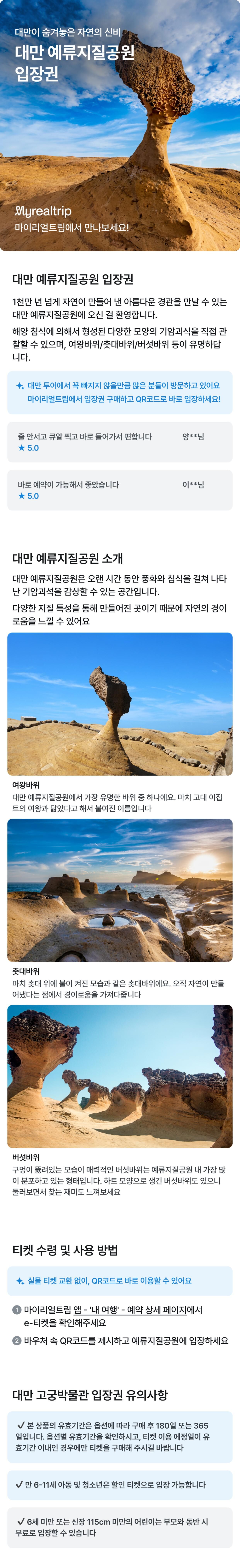 예류지질공원 입장권 (타이페이) 평점 5 · 리뷰 11건 포함 ※ 옵션 별 포함 사항은 [옵션 안내]란을 확인해 주세요. 불포함 • 기타 개인 경비 마이리얼트립에서 예약하기 타이페이 목록 도시 목록