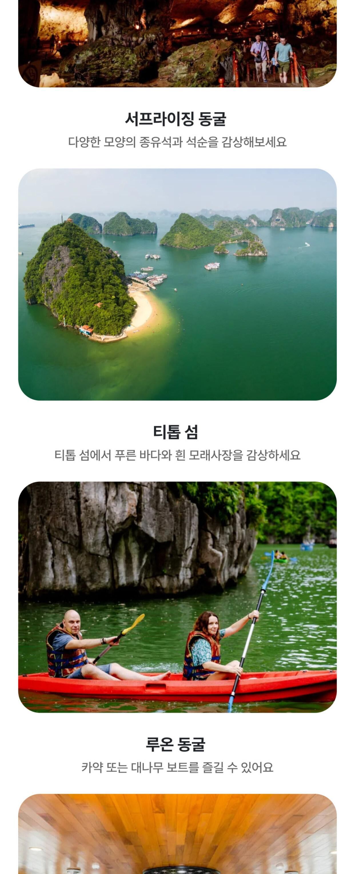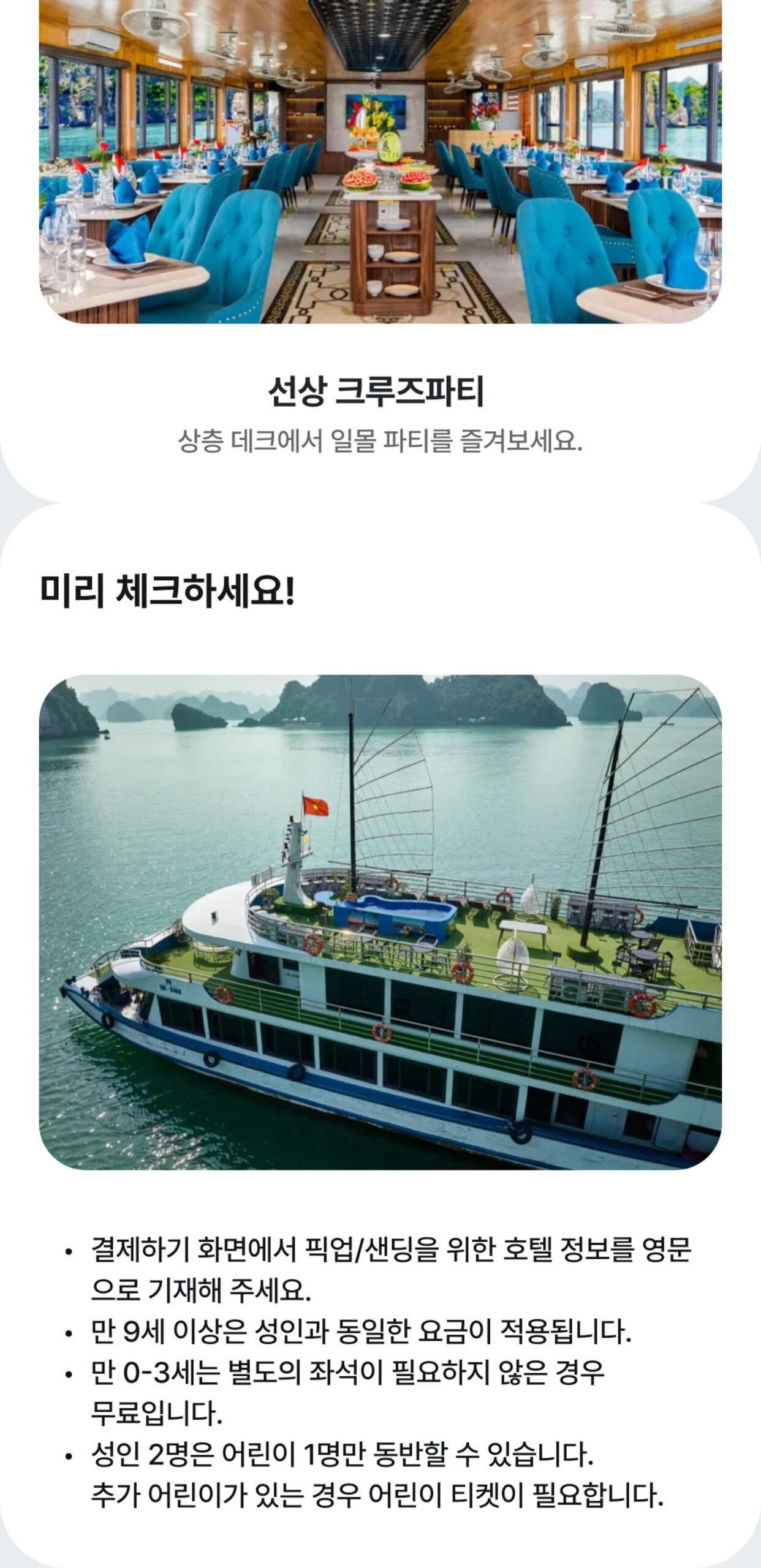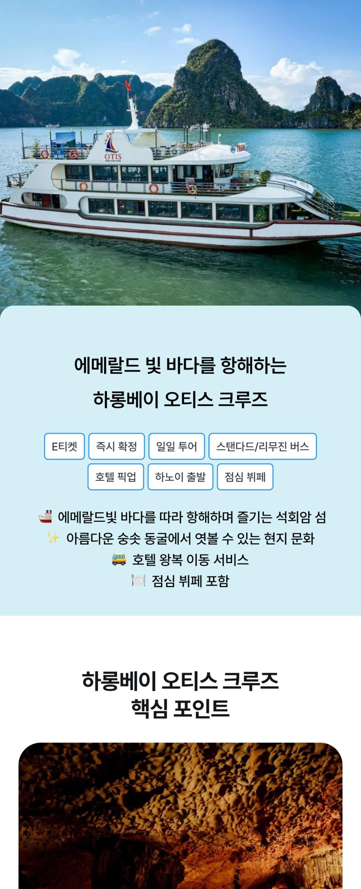 하롱베이 일일 투어 (오티스 크루즈) 평점 5 · 리뷰 1건 포함 • 어트랙션/명소 입장 • 영어 / 베트남어 가이드 • 전체 시설 이용 • 관광 보트 투어 • 구명조끼 • 하노이-하롱 왕복 이동 서비스 • 프리미엄 뷔페 점심 식사 • 선셋 파티: 와인, 차, 스낵 등 불포함 • 기타 개인 경비 • 팁 • 보험 • 음료 • 대나무 보트/카약 마이리얼트립에서 예약하기 하노이 목록 도시 목록