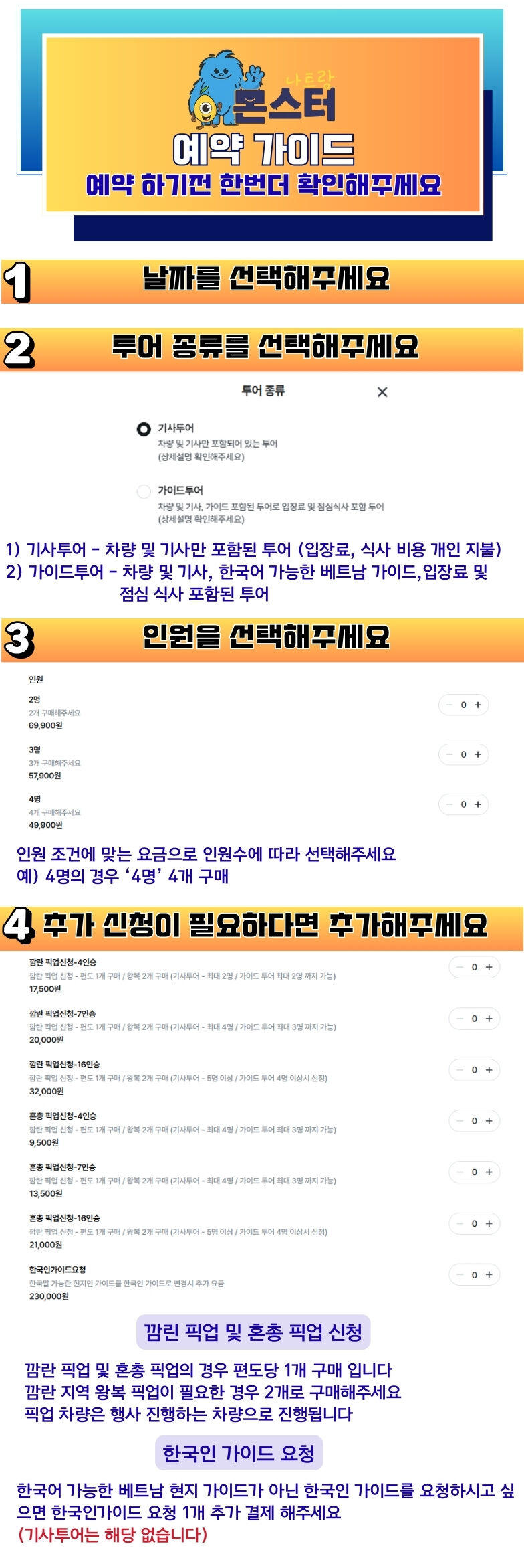 • 가이드 / 기사 팁 1인당 100,000동 (또는 $4)