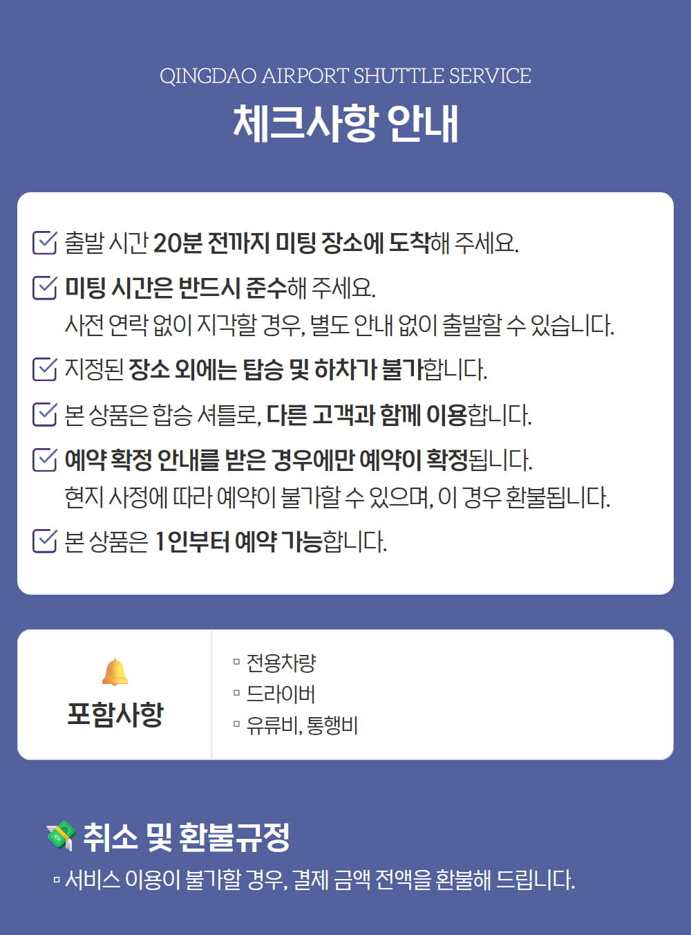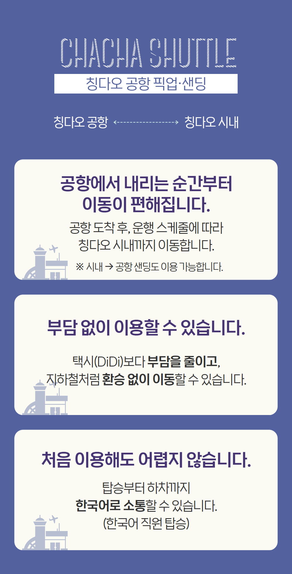[차차셔틀] 칭다오 공항픽업 샌딩 셔틀 한국어 직원 동행 (편도) 평점 4.9 · 리뷰 10건 포함 -합승 셔틀버스 -한국어 직원 -유류비 -통행비 불포함 -개인적으로 발생하는 비용 -여행자보험 마이리얼트립에서 예약하기 칭다오 목록 도시 목록